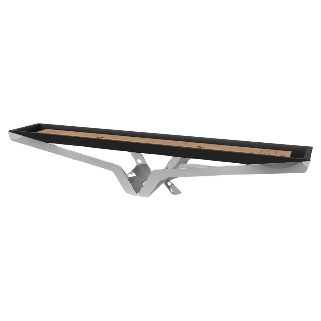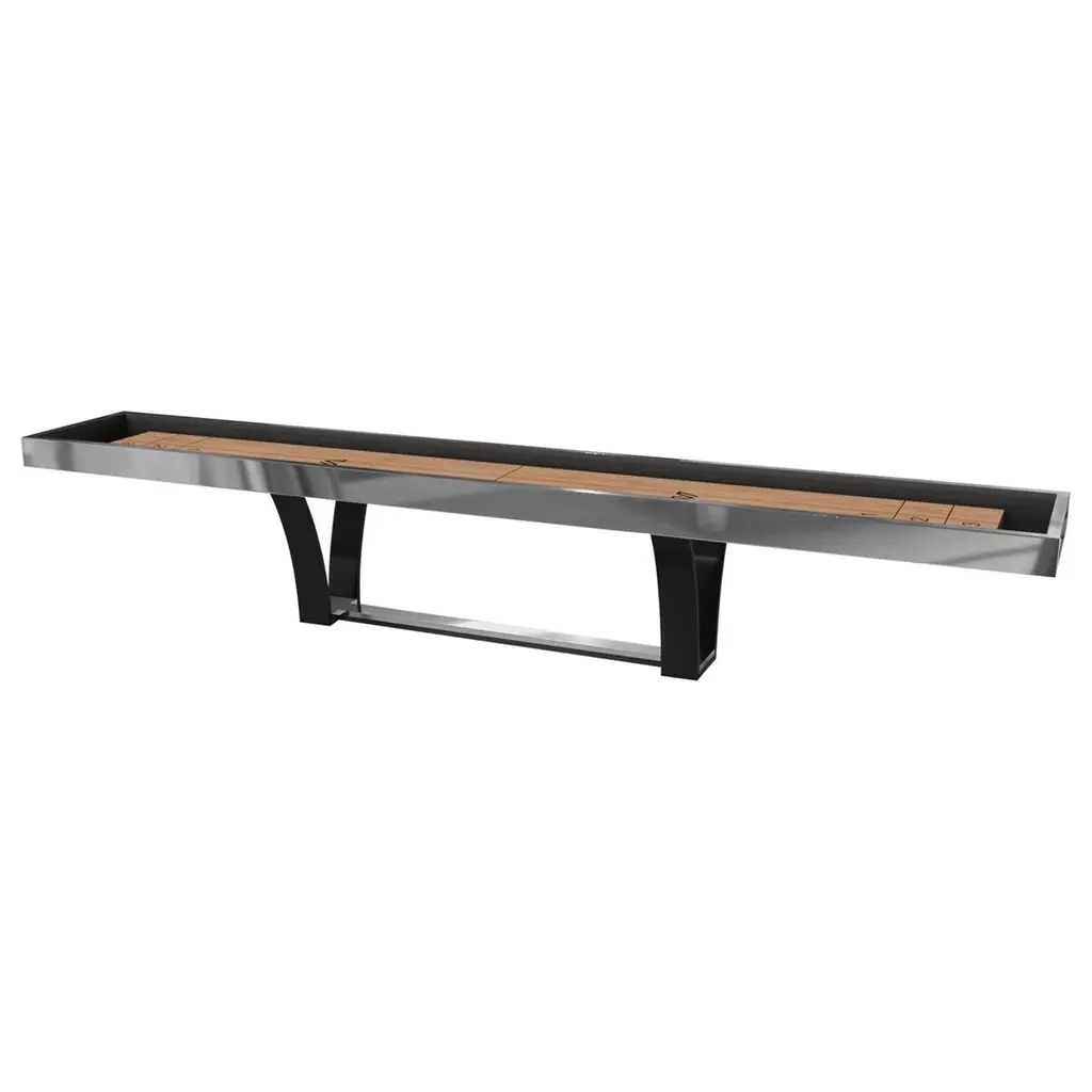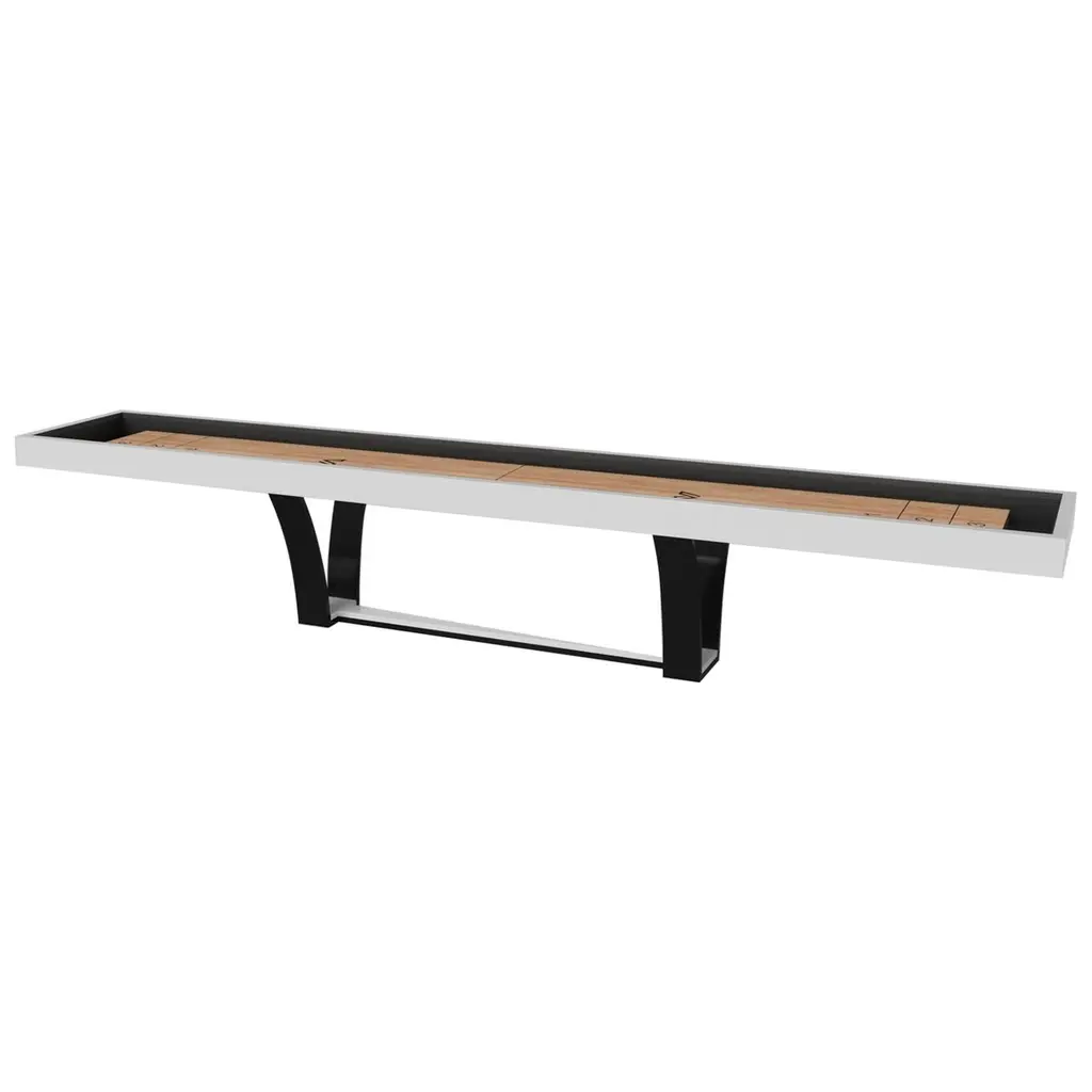 Inspired by the work of Antoni Gaudi and the movement of Catalan Modernism, the Draco shuffleboard table in Walnut boasts bold style with smooth, curved legs and a rich smooth professional grade Maple wood surface surface for professional game play. Expertly crafted from Walnut wood, this table features a high-end, contemporary design in a black finish with stark white accents.Size:16 Foot - 192”X32”X34”Playing Area Of 176”X20”