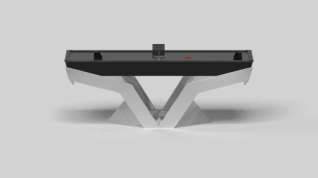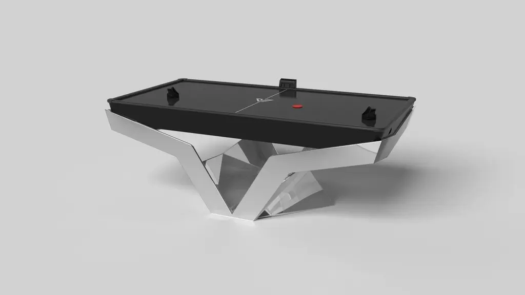 The Enzo air hockey table is Inspired by the aerodynamic angles of top-of-the-line European vehicles. Designed with sleek, V-shaped lines and a thoughtful use of negative space, this table boasts an energetic sense of spirit while epitomizing the look of luxury and evoking the sense of speed. A perfect catalyst for encouraging hours of friendly or competitive play, this handcrafted design is available in your choice of teak, white oak, curly maple, black/white, stainless steel, and custom colors.Size:88”X45”X31”