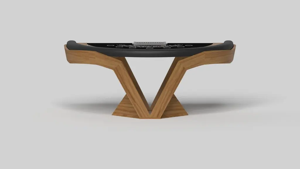 The Enzo blackjack table is Inspired by the aerodynamic angles of top-of-the-line European vehicles. Designed with sleek, V-shaped lines and a thoughtful use of negative space, this table boasts an energetic sense of spirit while epitomizing the look of luxury and evoking the sense of speed. A perfect catalyst for encouraging hours of friendly or competitive play, this handcrafted design is available in your choice of teak, white oak, curly maple, black/white, stainless steel, and custom colorsSize:88”X46”X30” (Bar Height)Custom Sizes Available Per Request