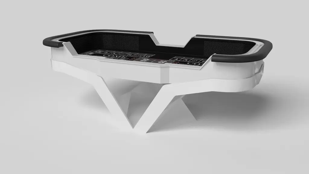 The Enzo craps table is Inspired by the aerodynamic angles of top-of-the-line European vehicles. Designed with sleek, V-shaped lines and a thoughtful use of negative space, this table boasts an energetic sense of spirit while epitomizing the look of luxury and evoking the sense of speed. A perfect catalyst for encouraging hours of friendly or competitive play, this handcrafted design is available in your choice of teak, white oak, curly maple, black/white, stainless steel, and custom colors.Size:117”X60”X42”Custom Sizes Available Per Request
