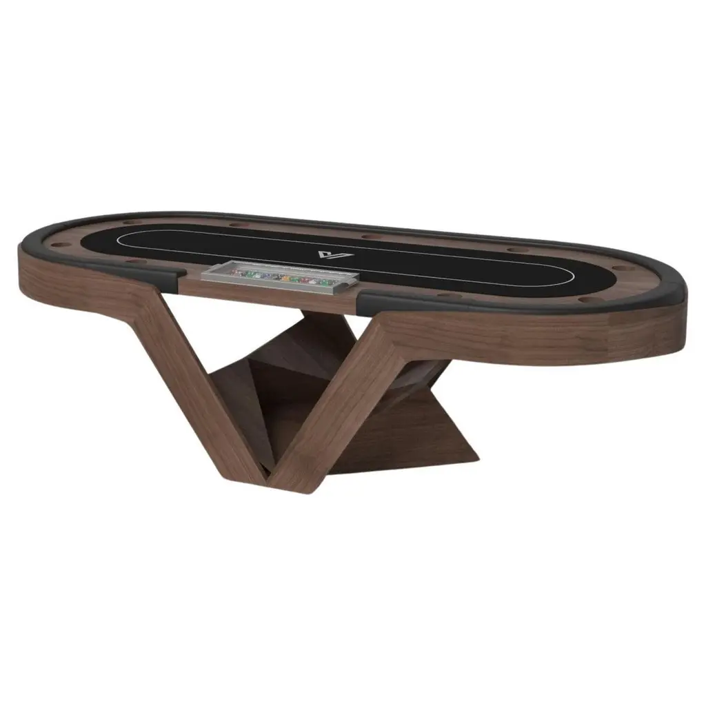 The Enzo poker table is Inspired by the aerodynamic angles of top-of-the-line European vehicles. Designed with sleek, V-shaped lines and a thoughtful use of negative space, this table boasts an energetic sense of spirit while epitomizing the look of luxury and evoking the sense of speed. A perfect catalyst for encouraging hours of friendly or competitive play, this handcrafted design is available in your choice of teak, white oak, curly maple, black/white, stainless steel, and custom colors.Size:104”X44”X30”Custom Sizes Available Per RequestCustom Table-Top Shapes Available Per Request
