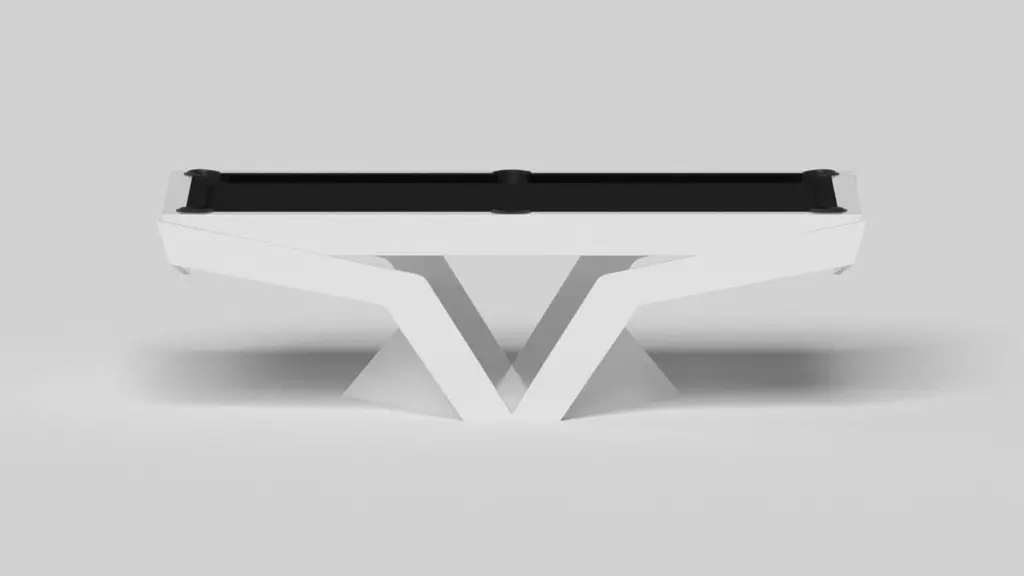 The Enzo pool table is Inspired by the aerodynamic angles of top-of-the-line European vehicles. Designed with sleek, V-shaped lines and a thoughtful use of negative space, this table boasts an energetic sense of spirit while epitomizing the look of luxury and evoking the sense of speed. A perfect catalyst for encouraging hours of friendly or competitive play, this handcrafted design is available in your choice of teak, white oak, curly maple, black/white, stainless steel, and custom colors.Size:9 Foot – 113”X63”Playing Area: 100”X50”