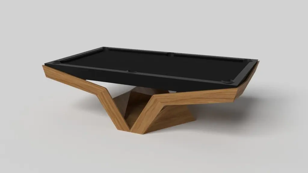 The Enzo pool table is Inspired by the aerodynamic angles of top-of-the-line European vehicles. Designed with sleek, V-shaped lines and a thoughtful use of negative space, this table boasts an energetic sense of spirit while epitomizing the look of luxury and evoking the sense of speed. A perfect catalyst for encouraging hours of friendly or competitive play, this handcrafted design is available in your choice of teak, white oak, curly maple, black/white, stainless steel, and custom colors.Size:8.5 Foot – 108”X60”Playing Area: 92”X46”