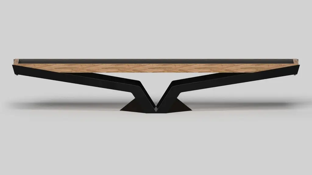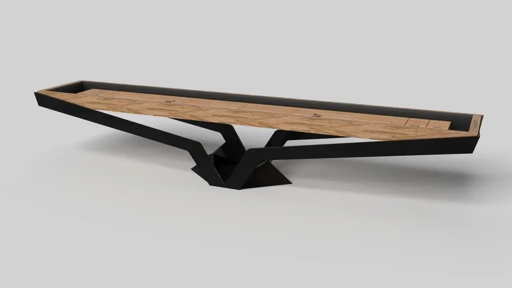 The Enzo shuffleboard table is Inspired by the aerodynamic angles of top-of-the-line European vehicles. Designed with sleek, V-shaped lines and a thoughtful use of negative space, this table boasts an energetic sense of spirit while epitomizing the look of luxury and evoking the sense of speed. A perfect catalyst for encouraging hours of friendly or competitive play, this handcrafted design is available in your choice of teak, white oak, curly maple, black/white, stainless steel, and custom colors.Size:14 Foot - 168”X32”X34”Playing Area Of 152”X20”
