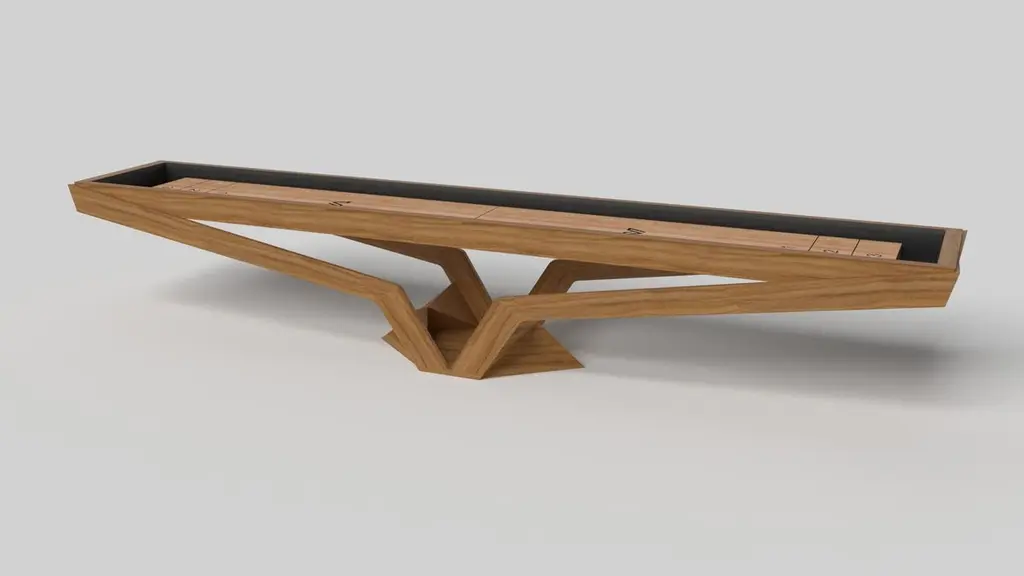 The Enzo shuffleboard table is Inspired by the aerodynamic angles of top-of-the-line European vehicles. Designed with sleek, V-shaped lines and a thoughtful use of negative space, this table boasts an energetic sense of spirit while epitomizing the look of luxury and evoking the sense of speed. A perfect catalyst for encouraging hours of friendly or competitive play, this handcrafted design is available in your choice of teak, white oak, curly maple, black/white, stainless steel, and custom colors.Size:18 Foot - 216”X32”X34”Playing Area Of 200”X20”