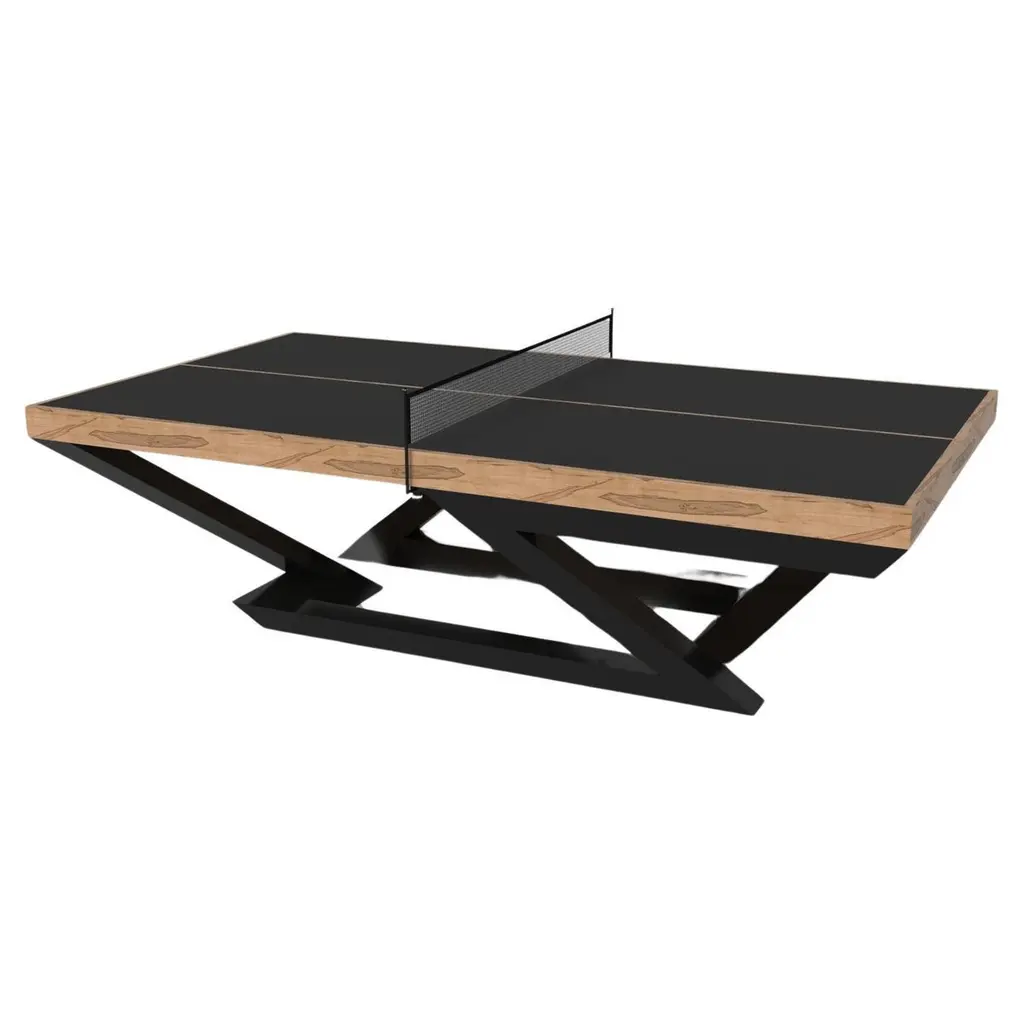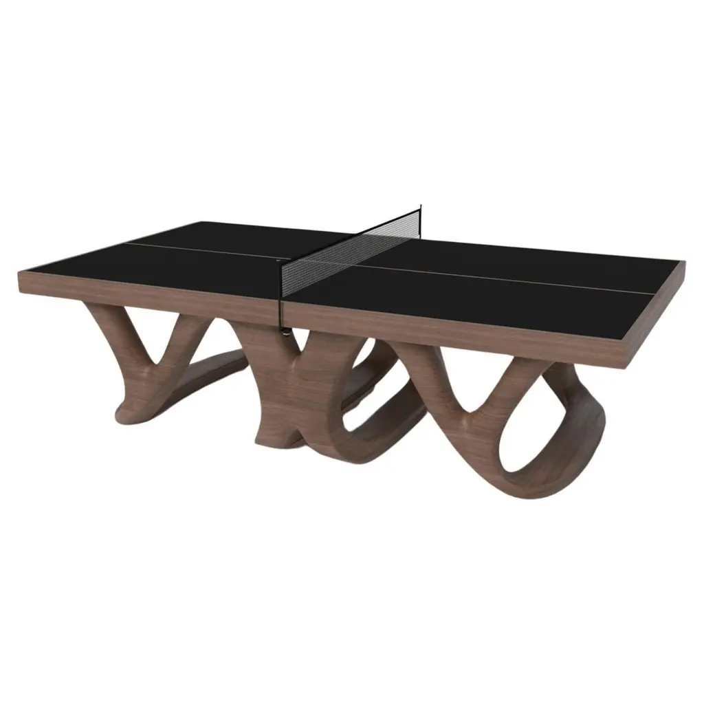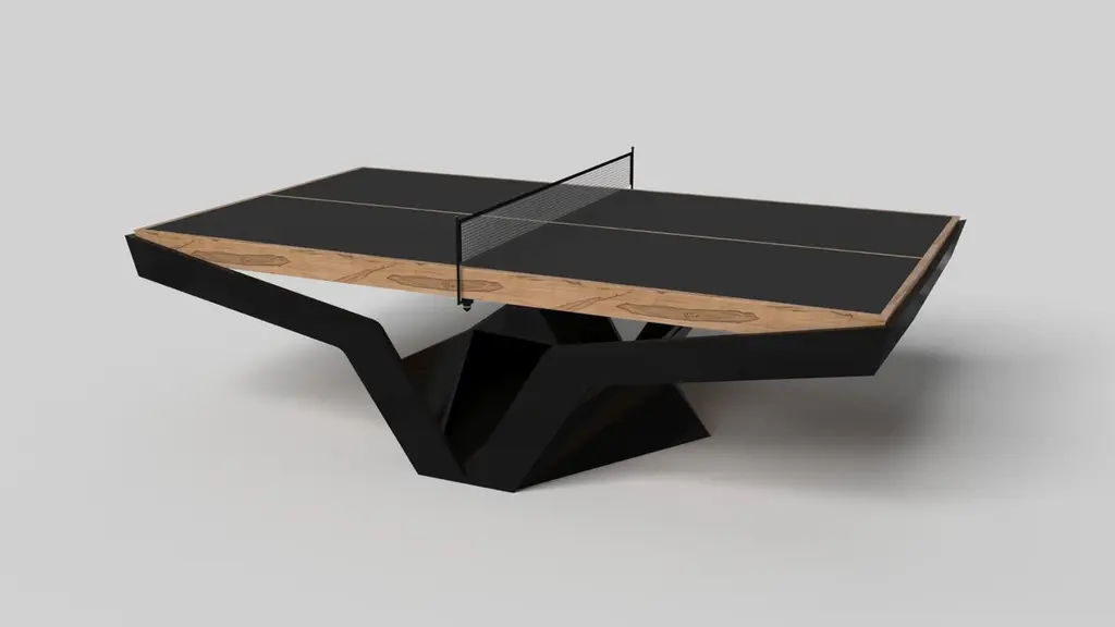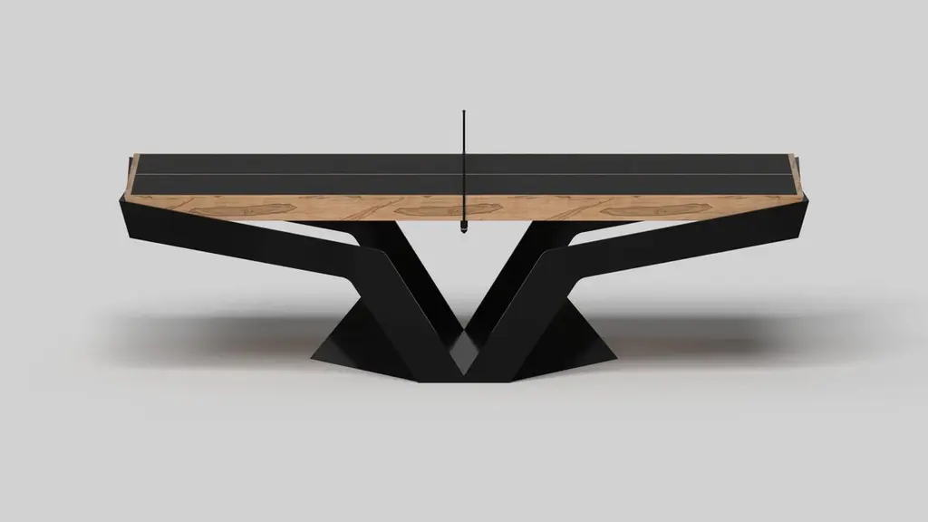 The Enzo table tennis table is Inspired by the aerodynamic angles of top-of-the-line European vehicles. Designed with sleek, V-shaped lines and a thoughtful use of negative space, this table boasts an energetic sense of spirit while epitomizing the look of luxury and evoking the sense of speed. A perfect catalyst for encouraging hours of friendly or competitive play, this handcrafted design is available in your choice of teak, white oak, curly maple, black/white, stainless steel, and custom colors.Size:108”X60”X30”Custom Sizes Available Per Request