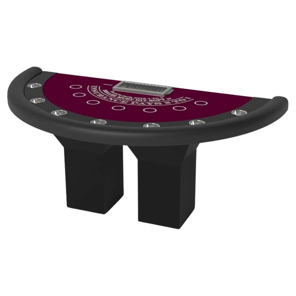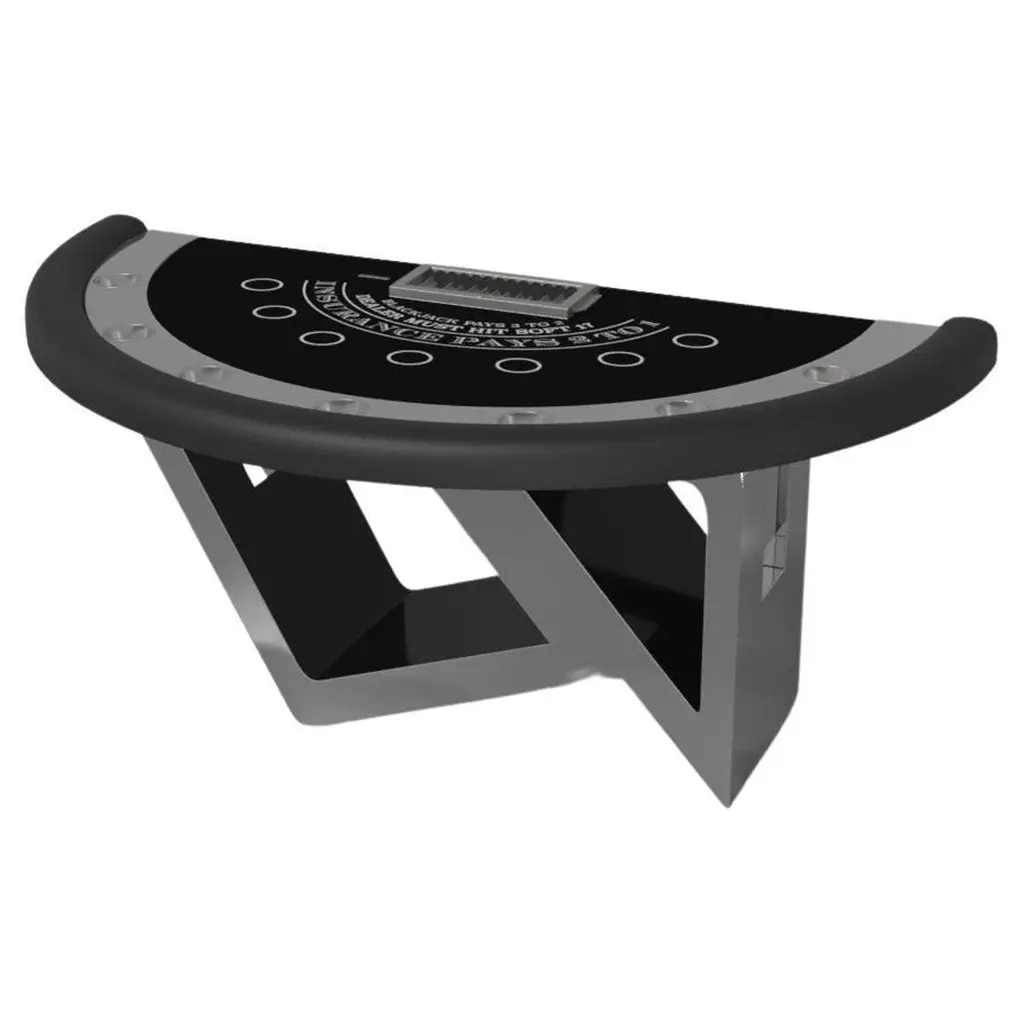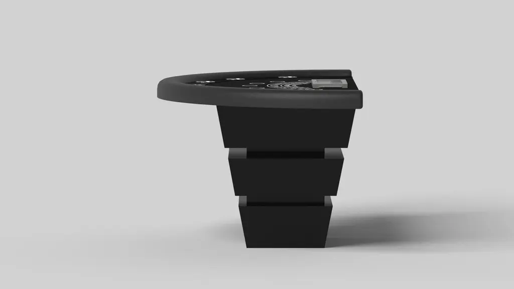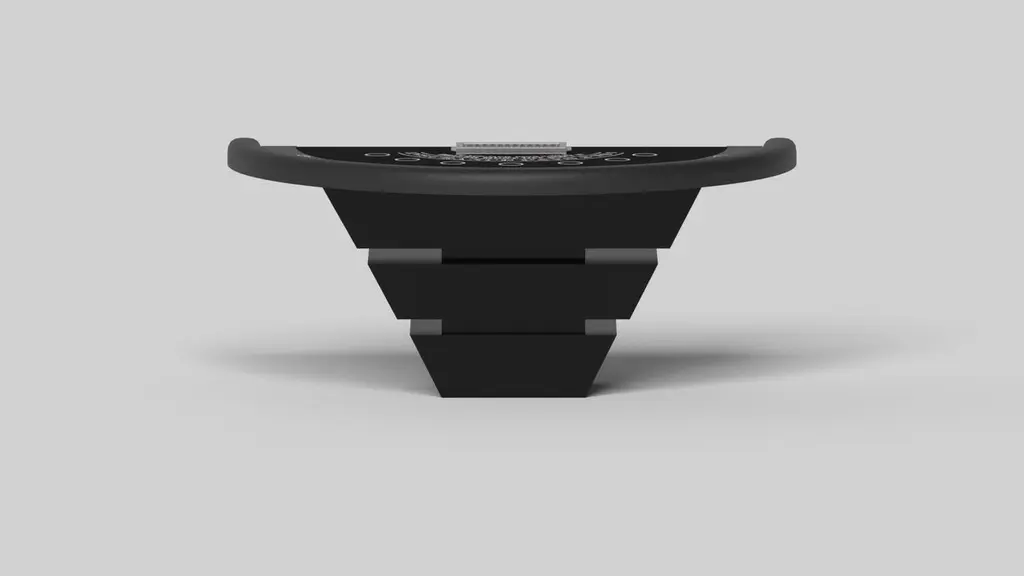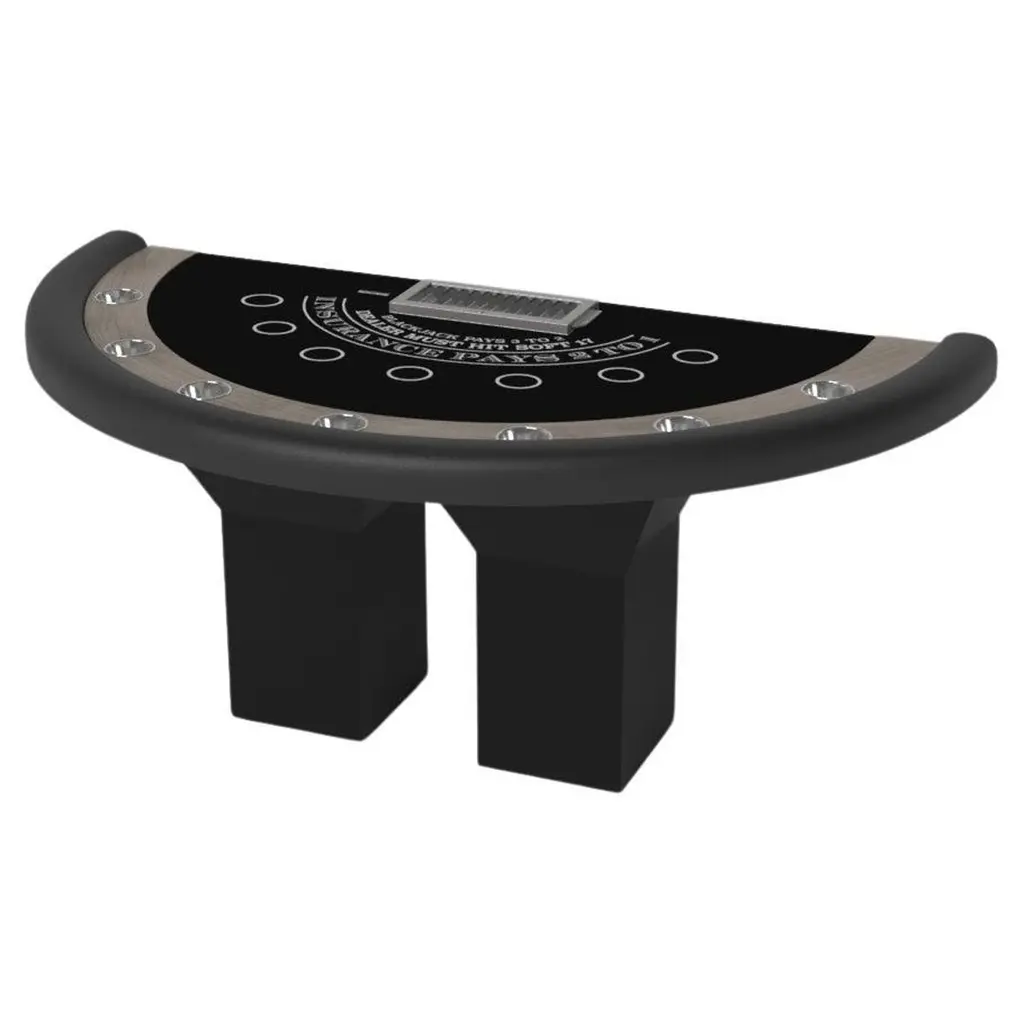Three solid pieces of wood seemingly float around a concealed center base, making the Louve blackjack table in brushed aluminum one of our most mind-bending designs. Crafted from solid wood and detailed with a chip rack and betting circles, this contemporary game table features a smooth hand-sanded finish with a tapered base that creates a timeless pyramidal form.Size:88”X46”X30” (Bar Height)Custom Sizes Available Per Request