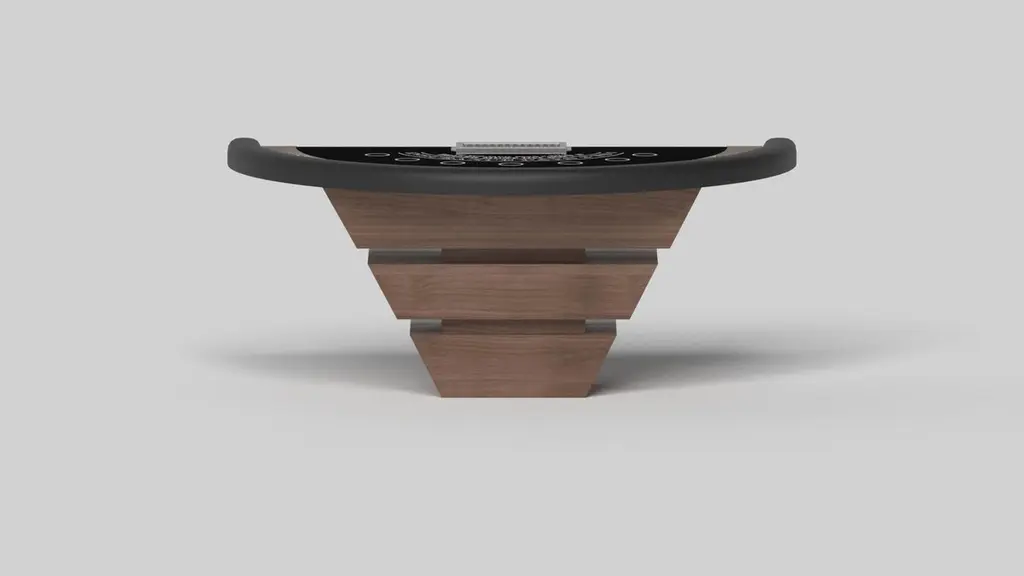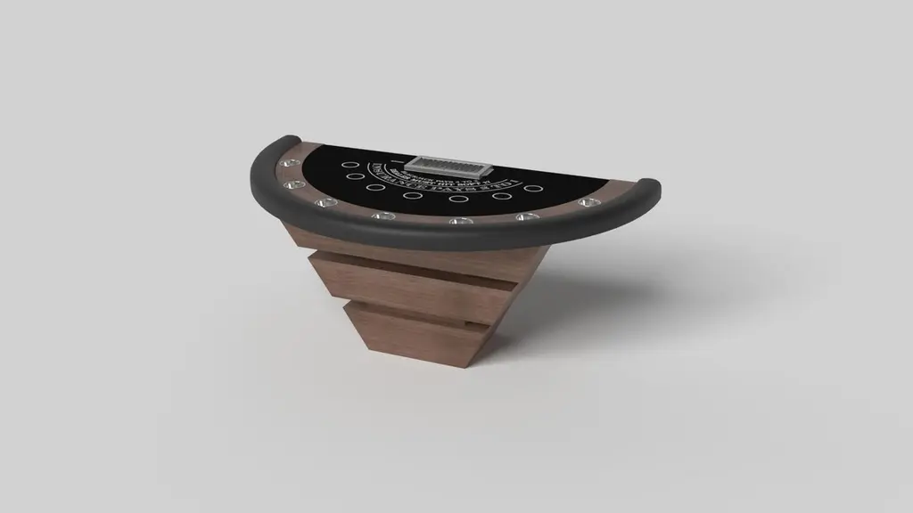 Three solid pieces of wood seemingly float around a concealed center base, making the Louve blackjack table in brushed aluminum one of our most mind-bending designs. Crafted from solid wood and detailed with a chip rack and betting circles, this contemporary game table features a smooth hand-sanded finish with a tapered base that creates a timeless pyramidal form.Size:88”X46”X30” (Bar Height)Custom Sizes Available Per Request