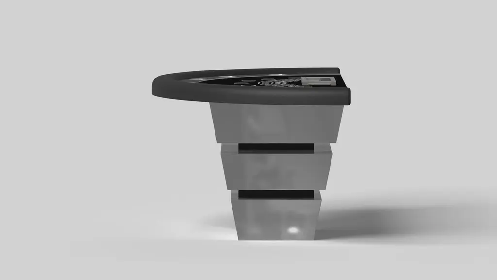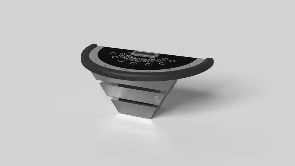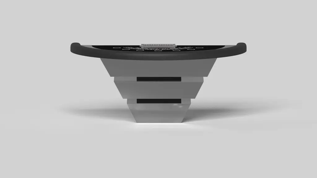 Three solid pieces of wood seemingly float around a concealed center base, making the Louve blackjack table in brushed aluminum one of our most mind-bending designs. Crafted from solid wood and detailed with a chip rack and betting circles, this contemporary game table features a smooth hand-sanded finish with a tapered base that creates a timeless pyramidal form.Size:88”X46”X30” (Bar Height)Custom Sizes Available Per Request