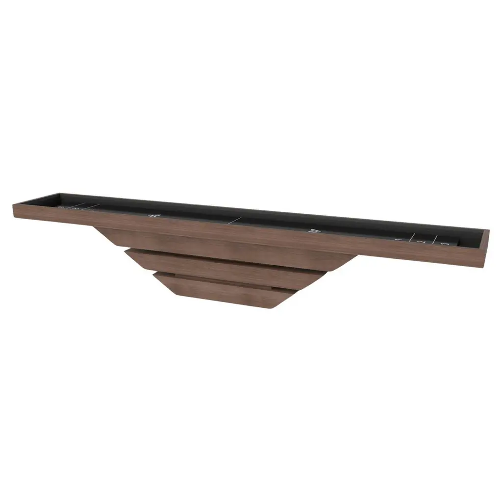 Three solid pieces of wood seemingly float around a concealed center base, making the Louve shuffleboard table in chrome one of our most mind-bending designs. Crafted from solid maple wood and detailed with a smooth professional grade Maple wood surface surface on top, this contemporary game table features a smooth hand-sanded finish with a tapered base that creates a timeless pyramidal form.Size:14 Foot - 168”X32”X34”Playing Area Of 152”X20”
