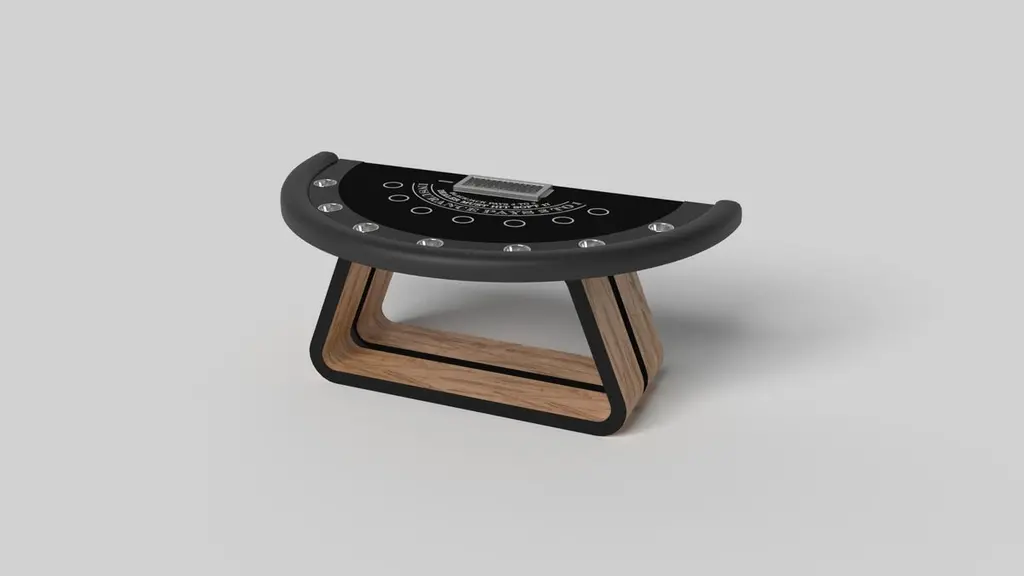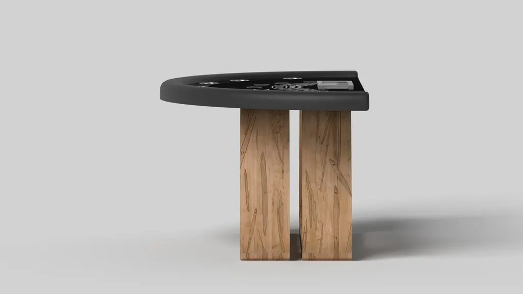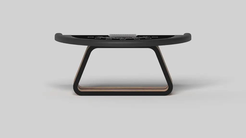 An open base with sweeping curves and smooth edges imparts a light, airy feel upon the Luge blackjack table in walnut. Evoking a sense of speed and the spirit of continuous movement, this exclusive game table features a split base with open sides and a semicircular table top that counterbalances the infinite curvature of the rounded base. The top is beautifully detailed with a chip rack and betting circles that encourage hours of endless game play.Size:88”X46”X30” (Bar Height)Custom Sizes Available Per Request