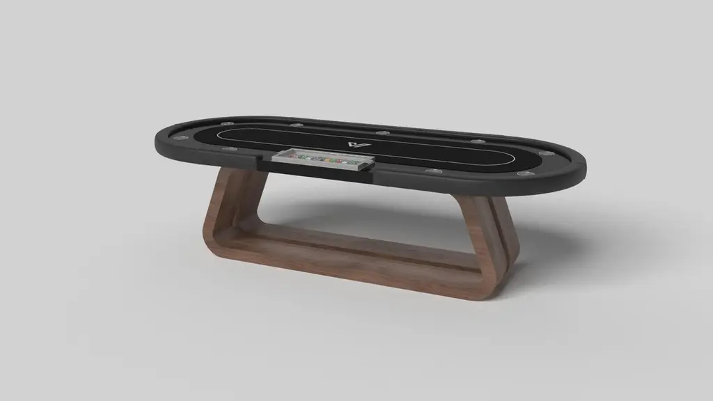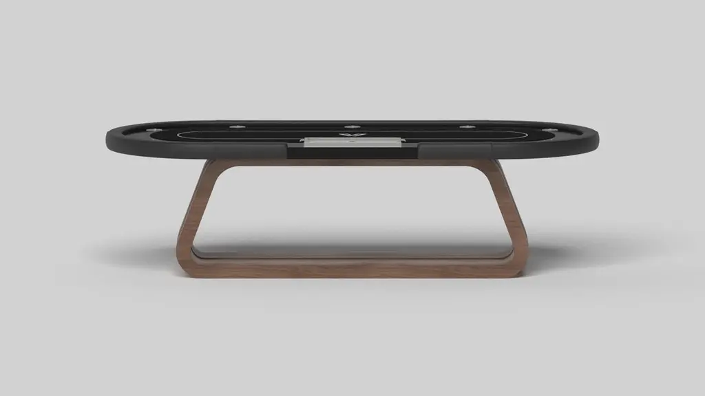 An open base with sweeping curves and smooth edges imparts a light, airy feel upon the Luge poker table in walnut. Evoking a sense of speed and the spirit of continuous movement, this exclusive wood game table features a split base with open sides and a detailed top that counterbalances the infinite curvature of the rounded base.Size:104”X44”X30”Custom Sizes Available Per RequestCustom Table-Top Shapes Available Per Request