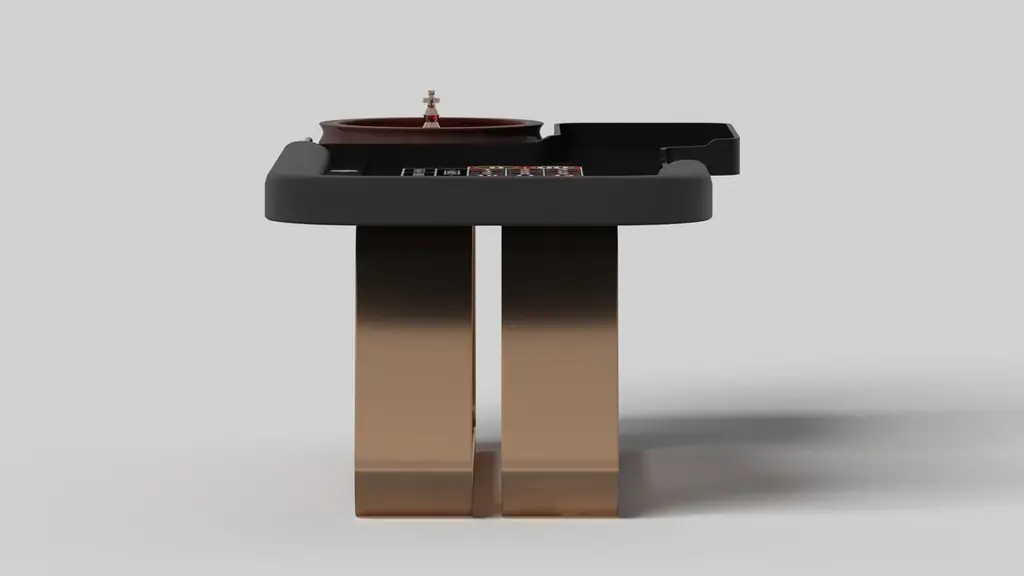 An open base with sweeping curves and smooth edges imparts a light, airy feel upon the Luge roulette table in walnut. Evoking a sense of speed and the spirit of continuous movement, this exclusive game table features a split base with open sides and a rectangular table top that counterbalances the infinite curvature of the rounded base. The top is beautifully detailed with bet boxes and an American wheel to encourage hours of endless game play.Size:98”X50”X30”Custom Sizes Available Per Request