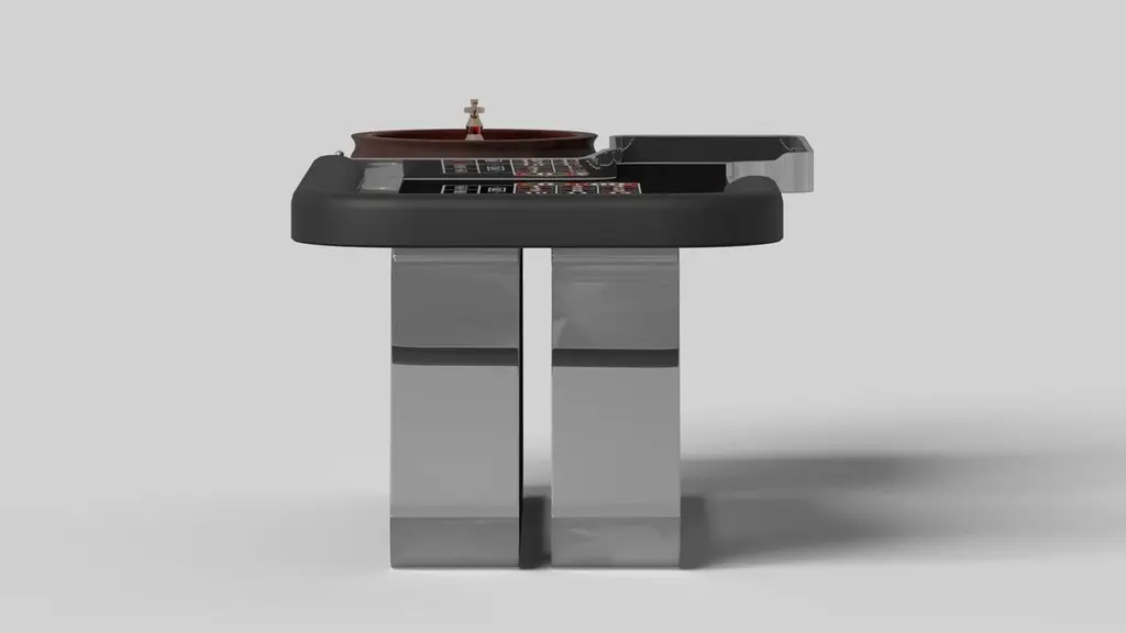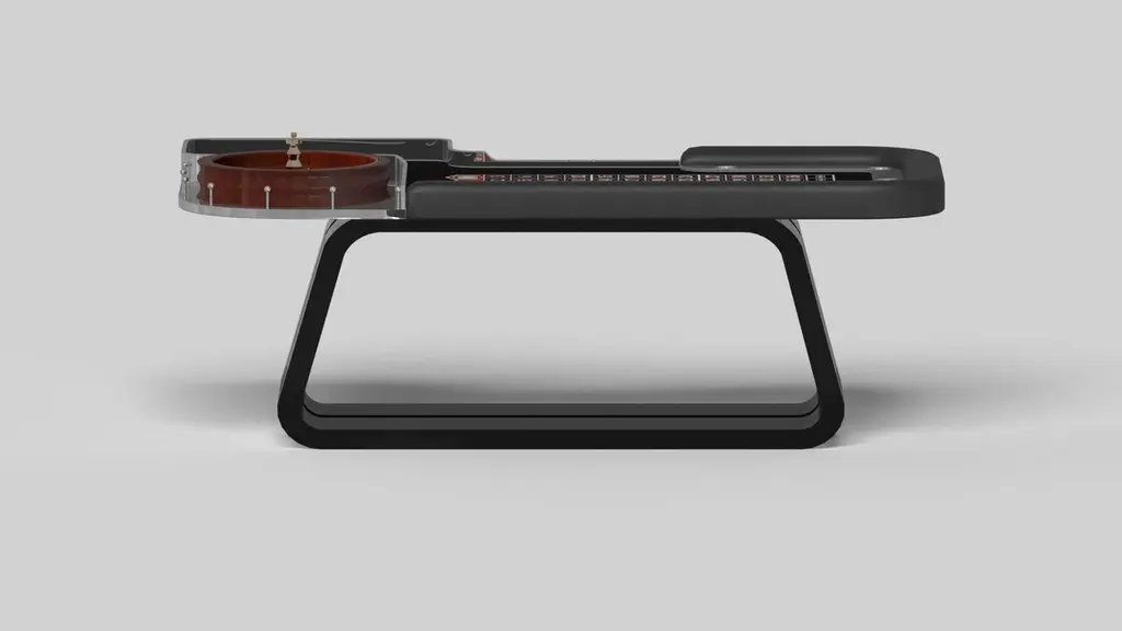 An open base with sweeping curves and smooth edges imparts a light, airy feel upon the Luge roulette table in walnut. Evoking a sense of speed and the spirit of continuous movement, this exclusive game table features a split base with open sides and a rectangular table top that counterbalances the infinite curvature of the rounded base. The top is beautifully detailed with bet boxes and an American wheel to encourage hours of endless game play.Size:98”X50”X30”Custom Sizes Available Per Request