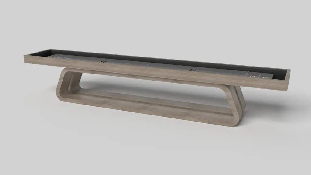 An open base with sweeping curves and smooth edges imparts a light, airy feel upon the Luge shuffleboard table in walnut. Evoking a sense of speed and the spirit of continuous movement, this exclusive wood game table features a split base with open sides and a classic rectangular table top that counterbalances the infinite curvature of the rounded base. The top is beautifully detailed with a smooth professional grade Maple wood surface surface that encourages hours of endless game play.Size:16 Foot - 192”X32”X34”Playing Area Of 176”X20”