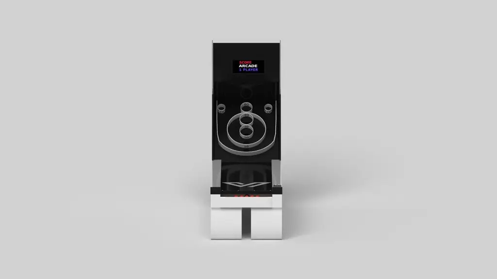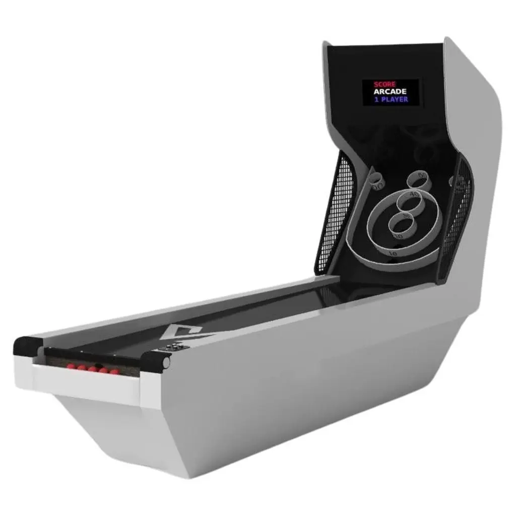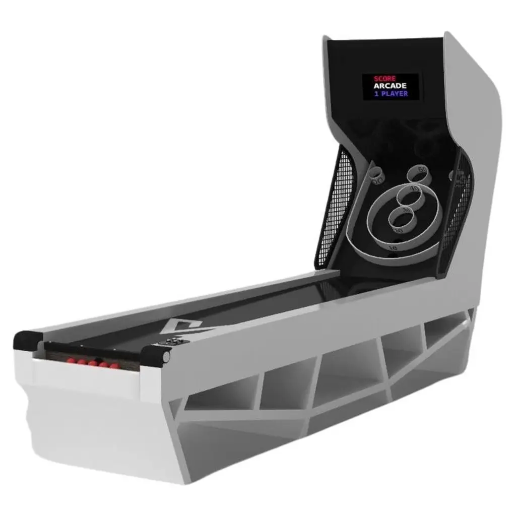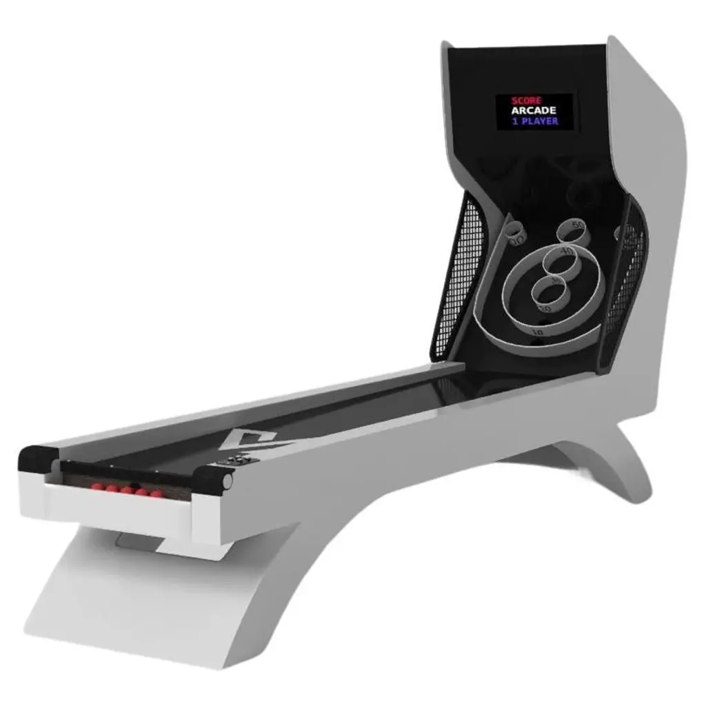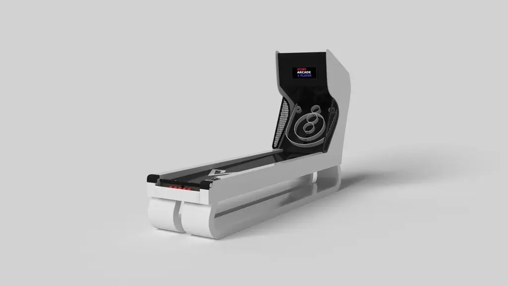 An open base with sweeping curves and smooth edges imparts a light, airy feel upon the Luge skeeball game. Evoking a sense of speed and the spirit of continuous movement, this exclusive game features a split base with open sides and rectangular panels that counterbalance the infinite curvature of the rounded base. It's detailed with built-in digital components, including LED lights and sound effects.