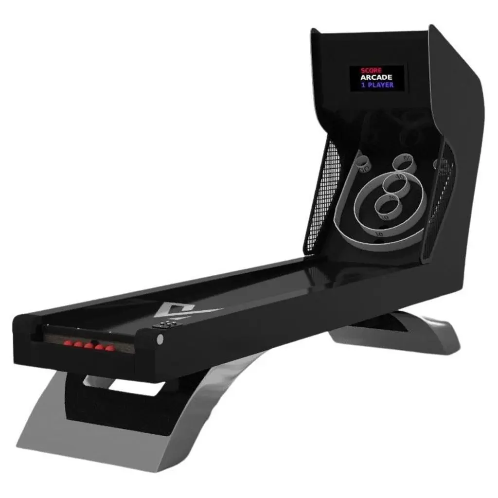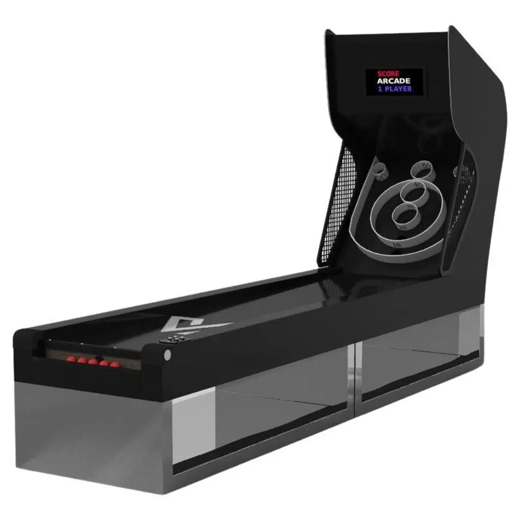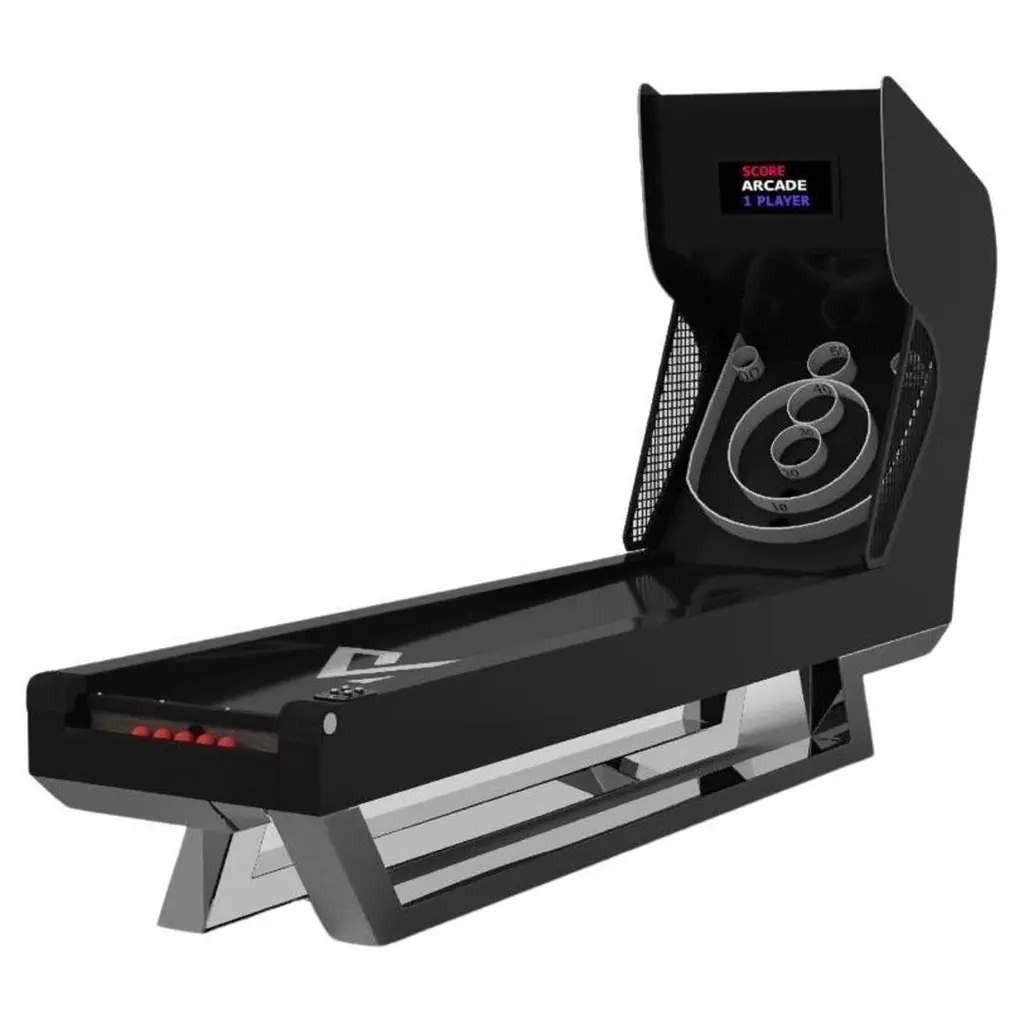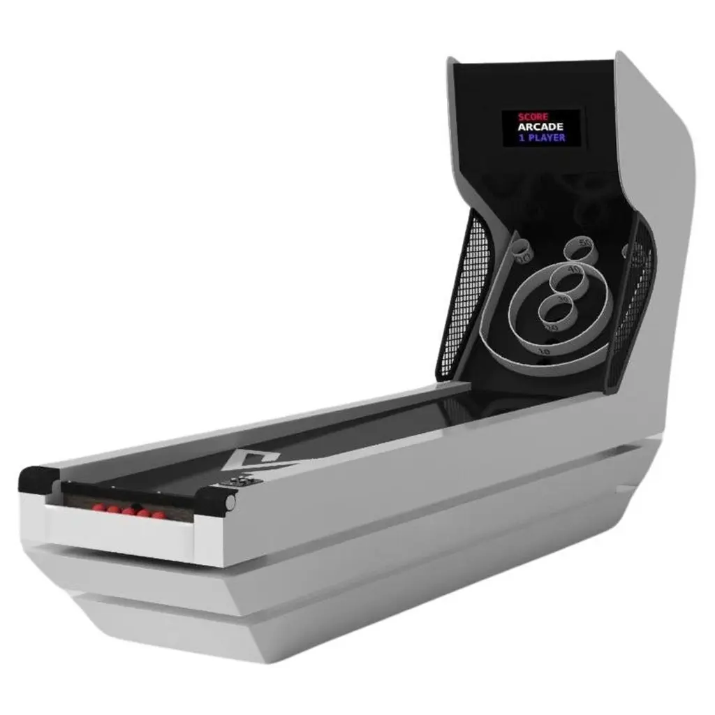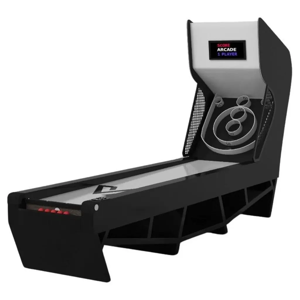 An open base with sweeping curves and smooth edges imparts a light, airy feel upon the Luge skeeball game. Evoking a sense of speed and the spirit of continuous movement, this exclusive game features a split base with open sides and rectangular panels that counterbalance the infinite curvature of the rounded base. It's detailed with built-in digital components, including LED lights and sound effects.