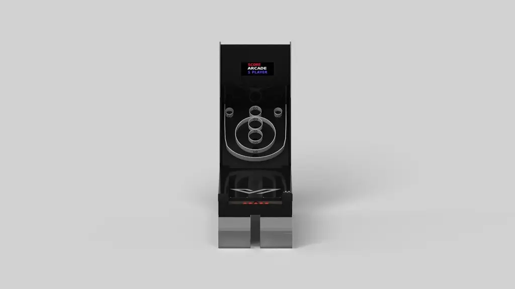 An open base with sweeping curves and smooth edges imparts a light, airy feel upon the Luge skeeball game. Evoking a sense of speed and the spirit of continuous movement, this exclusive game features a split base with open sides and rectangular panels that counterbalance the infinite curvature of the rounded base. It's detailed with built-in digital components, including LED lights and sound effects.