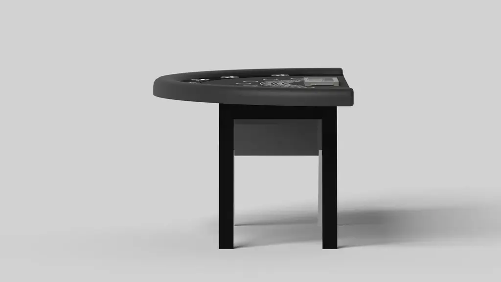 Simple yet sophisticated, the Mantis blackjack table puts a fresh, modern spin on a classic four-legged design. Sharp angles and tapered legs provide sleek stability.Size:88”X46”X30” (Bar Height)Custom Sizes Available Per Request