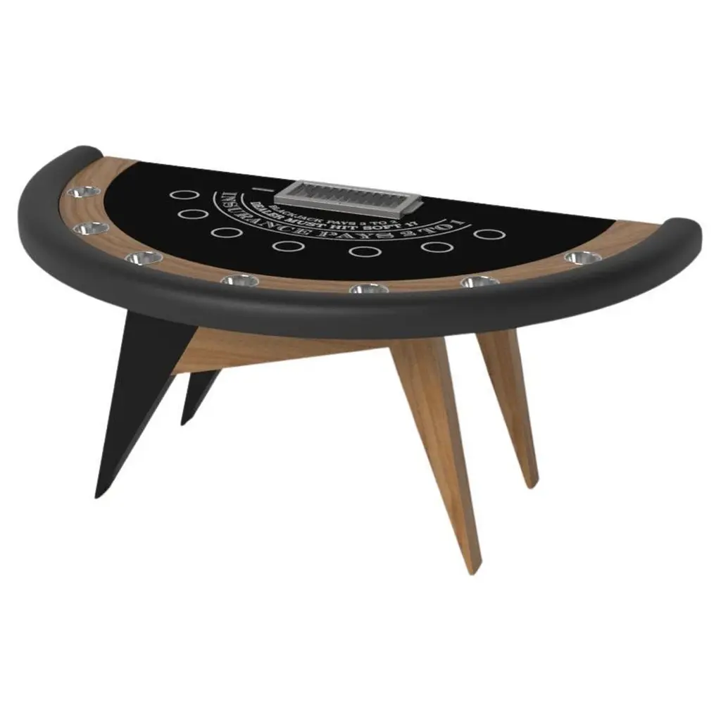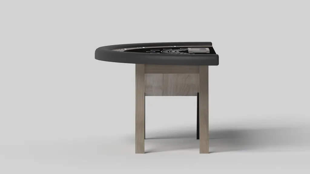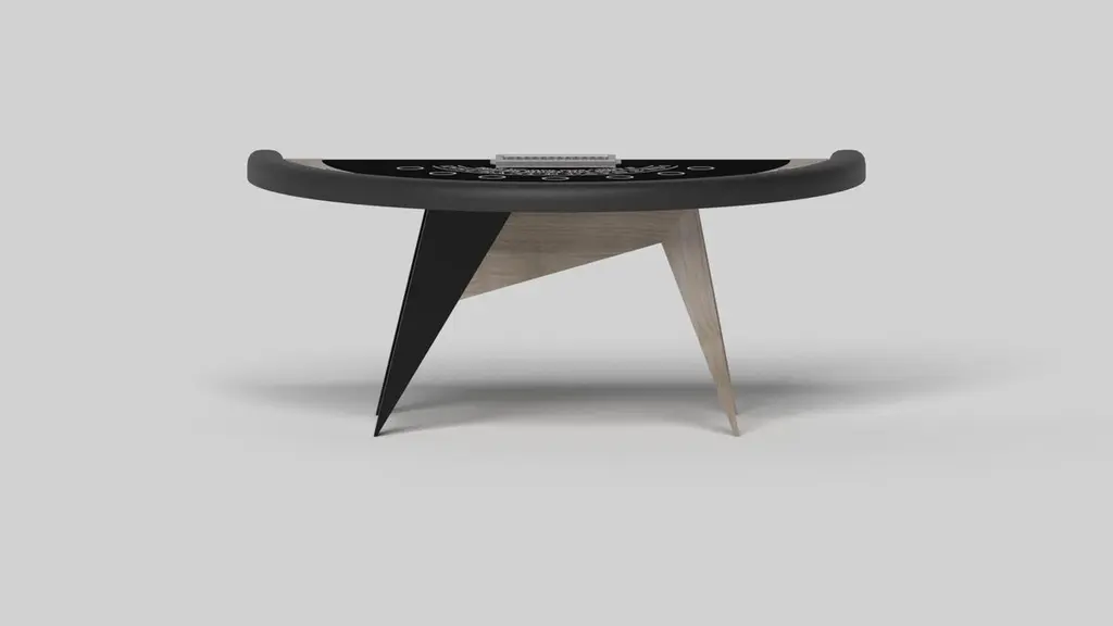 Simple yet sophisticated, the Mantis blackjack table puts a fresh, modern spin on a classic four-legged design. Sharp angles and tapered legs provide sleek stability.Size:88”X46”X30” (Bar Height)Custom Sizes Available Per Request