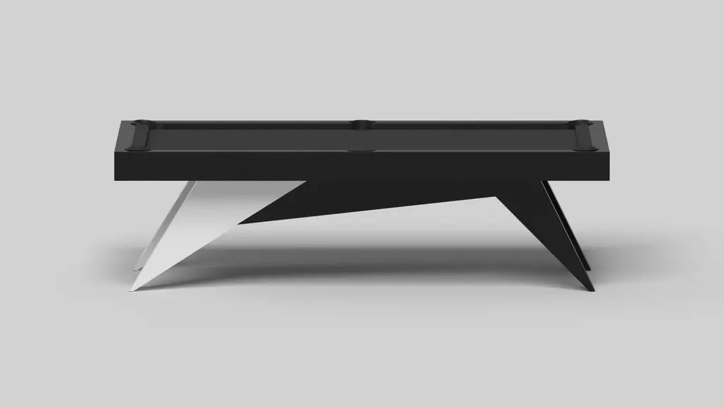 Simple yet sophisticated, the Mantis pool table in black with brushed aluminum puts a fresh, modern spin on a classic four-legged design. Sharp angles and tapered legs provide sleek stability, while contrast metal trim adds an air of exuberance and an energetic spirit. Handcrafted from black oil-stained maple wood, this table features a bold design with a smooth black top and brushed aluminum accentsSize:8.5 Foot – 108”X60”Playing Area: 92”X46”