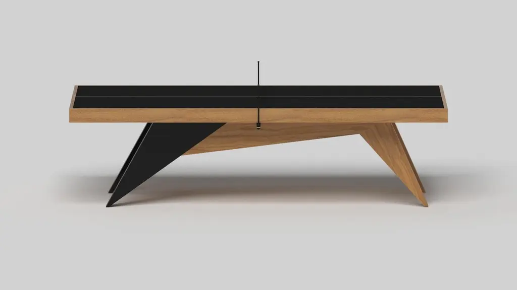 Simple yet sophisticated, the Mantis table tennis table in black with brushed aluminum puts a fresh, modern spin on a classic four-legged design. Sharp angles and tapered legs provide sleek stability, while contrast metal trim adds an air of exuberance and an energetic spirit. Handcrafted from black oil-stained maple wood, this table features a bold design with a smooth black top and brushed aluminum accents. Size:108”X60”X30”Custom Sizes Available Per Request