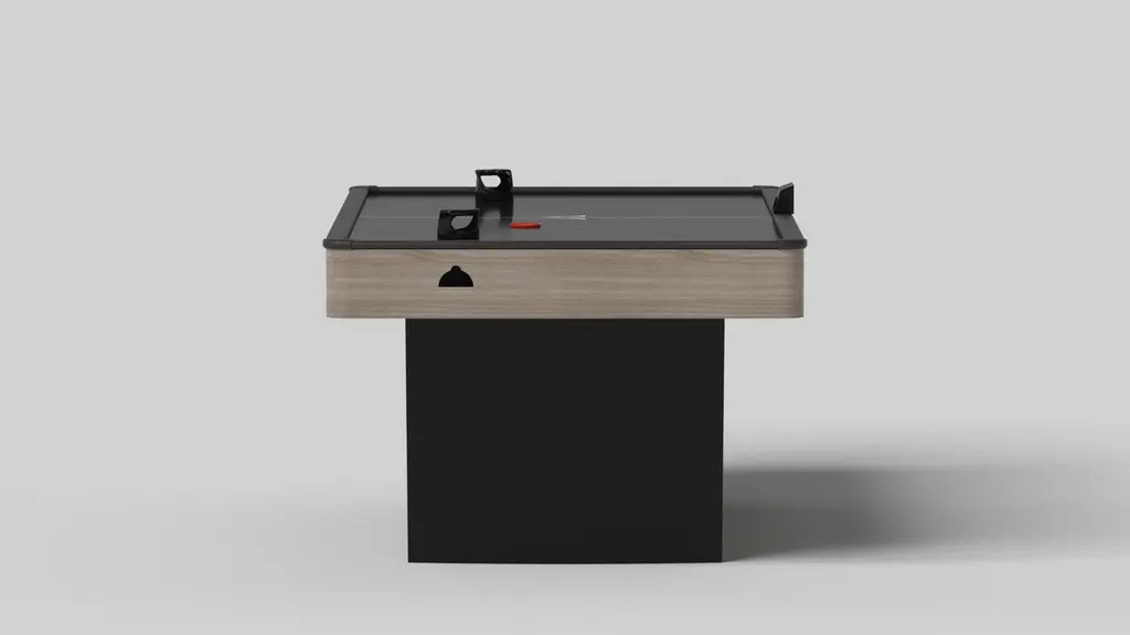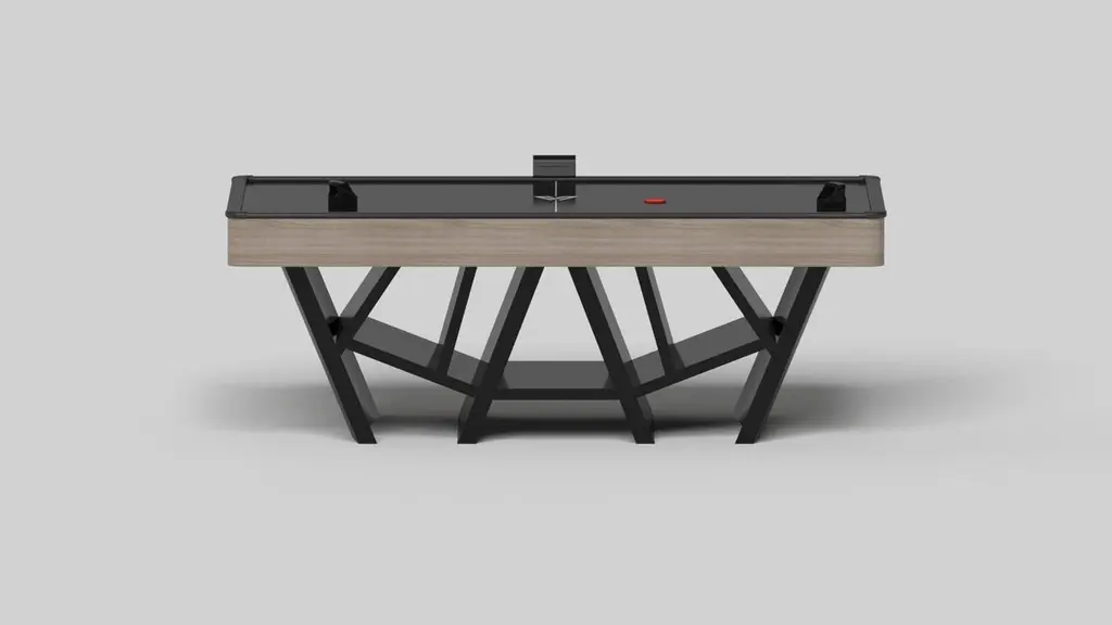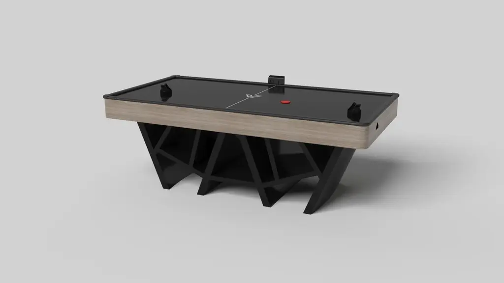 With a combination of acute angles, smooth lines, and geometric configurations, the Maze air hockey table in walnut is characterized by a labyrinth-inspired base with a mystifying motif. Beautifully detailed with a smooth black top for game play, this luxury walnut wood game table exudes cutting edge style and contemporary charm, making it a fascinating focal point in any room.Size:88”X45”X31”