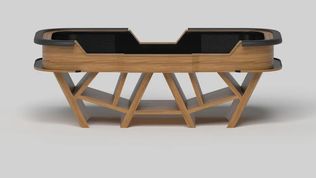 With a combination of acute angles, smooth lines, and geometric configurations, the Maze craps table in walnut is characterized by a labyrinth-inspired base with a mystifying motif. Beautifully detailed with a professional top for extended game play, this luxury game table exudes cutting edge style and contemporary charm, making it a fascinating focal point in any room.Size:117”X60”X42”Custom Sizes Available Per Request