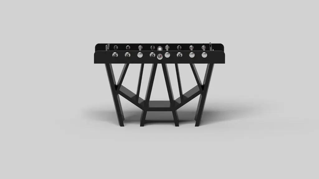 Drawing inspiration from the beauty of geometric forms, the Rumba foosball table in brushed aluminum is characterized by a series of hollow and solid shapes that form an offset asymmetric base. Accented with a high-action top for professional game play, this custom table features a high-end designer appeal that coordinates seamlessly into any modern room design.Size:62”X31”X36”