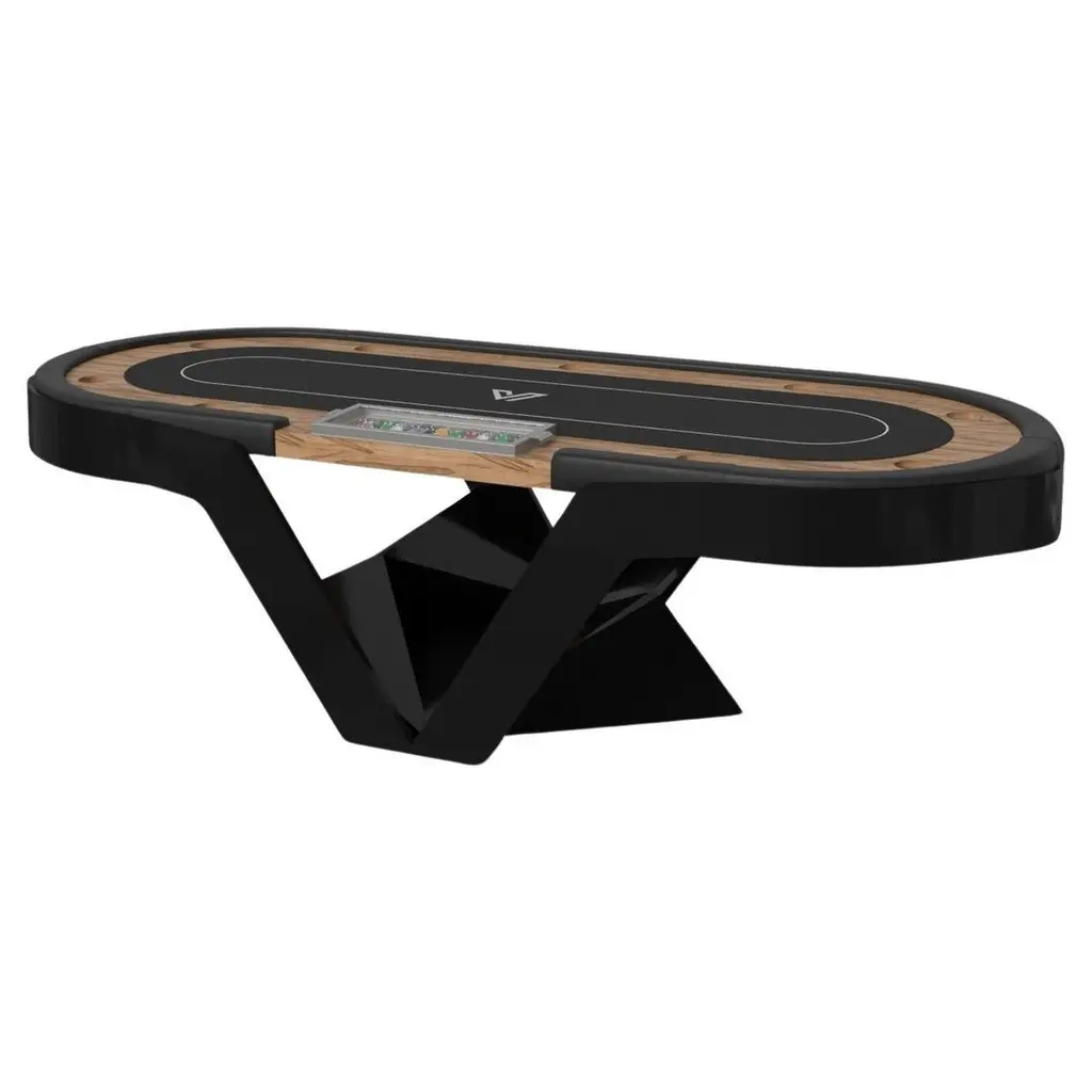 With a combination of acute angles, smooth lines, and geometric configurations, the Maze poker table in walnut is characterized by a labyrinth-inspired base with a mystifying motif. Beautifully detailed for professional game play, this luxury wood game table exudes cutting edge style and contemporary charm, making it a fascinating focal point in any room.Size:104”X44”X30”Custom Sizes Available Per RequestCustom Table-Top Shapes Available Per Request