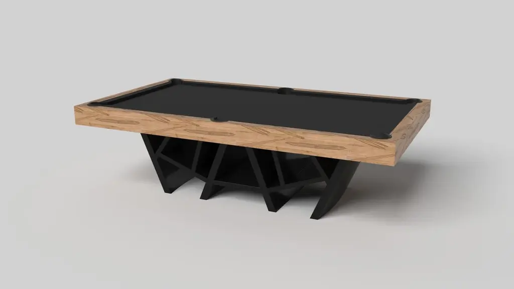 With a combination of acute angles, smooth lines, and geometric configurations, the Maze pool table in walnut is characterized by a labyrinth-inspired base with a mystifying motif. Beautifully detailed with a smooth black top for game play, this luxury wood game table exudes cutting edge style and contemporary charm, making it a fascinating focal point in any room.Size:9 Foot – 113”X63”Playing Area: 100”X50”