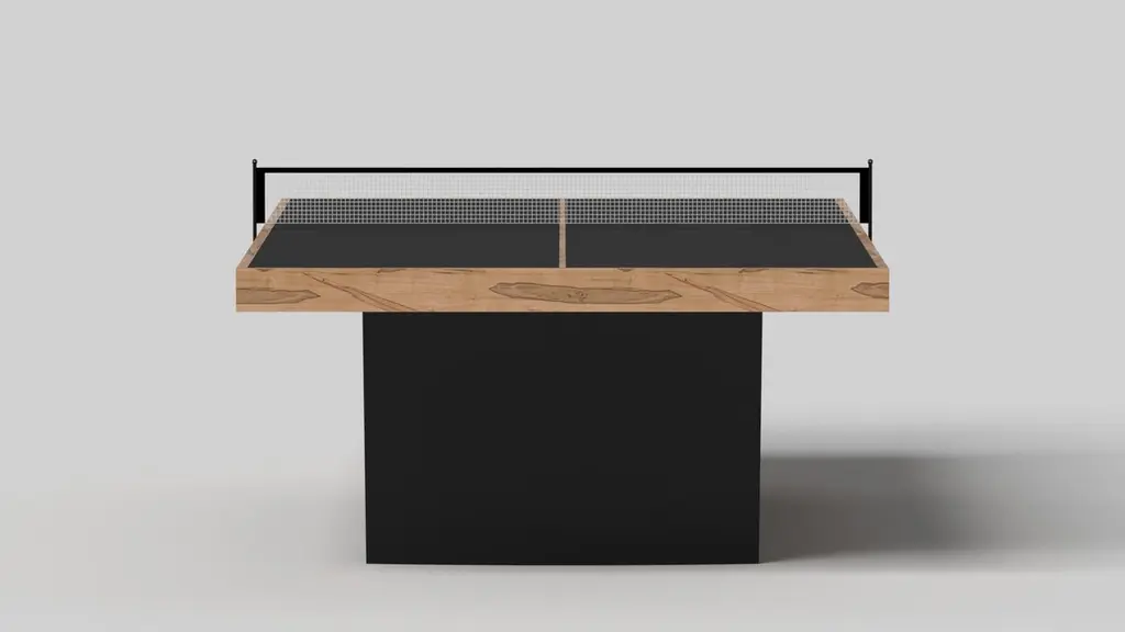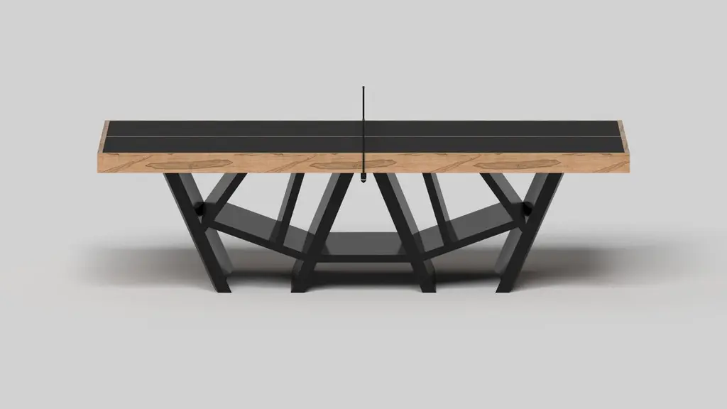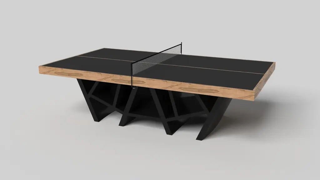 With a combination of acute angles, smooth lines, and geometric configurations, the Maze table tennis table in walnut is characterized by a labyrinth-inspired base with a mystifying motif. Beautifully detailed with a smooth black top for game play, this luxury wood game table exudes cutting edge style and contemporary charm, making it a fascinating focal point in any room. Size:108”X60”X30”Custom Sizes Available Per Request