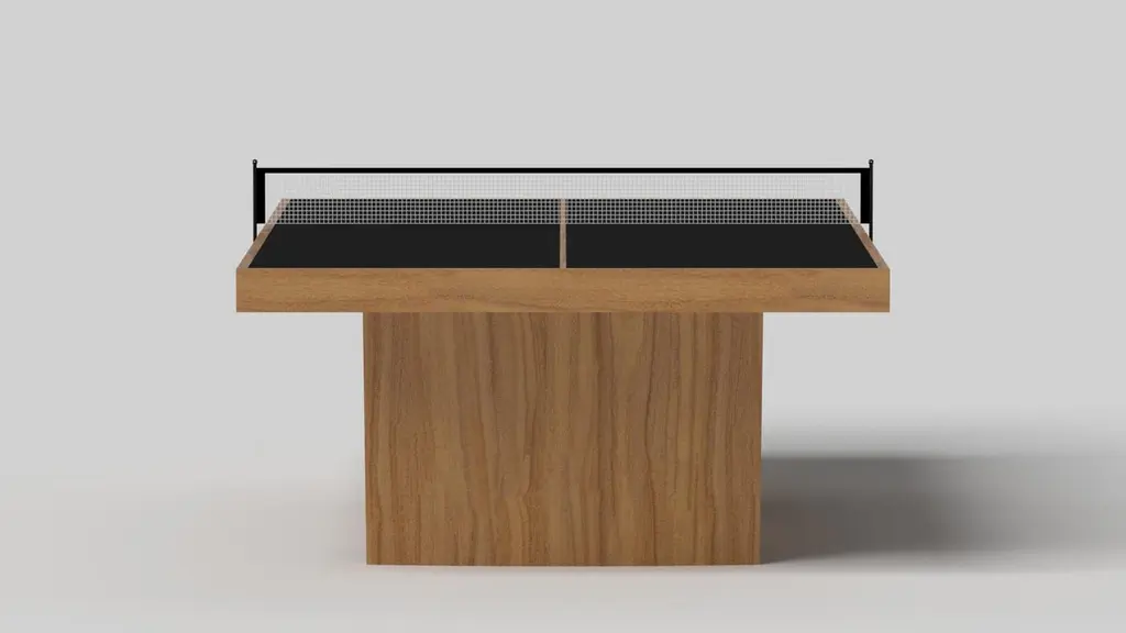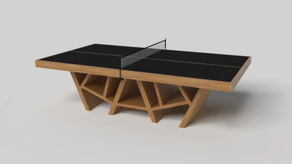 With a combination of acute angles, smooth lines, and geometric configurations, the Maze table tennis table in walnut is characterized by a labyrinth-inspired base with a mystifying motif. Beautifully detailed with a smooth black top for game play, this luxury wood game table exudes cutting edge style and contemporary charm, making it a fascinating focal point in any room. Size:108”X60”X30”Custom Sizes Available Per Request