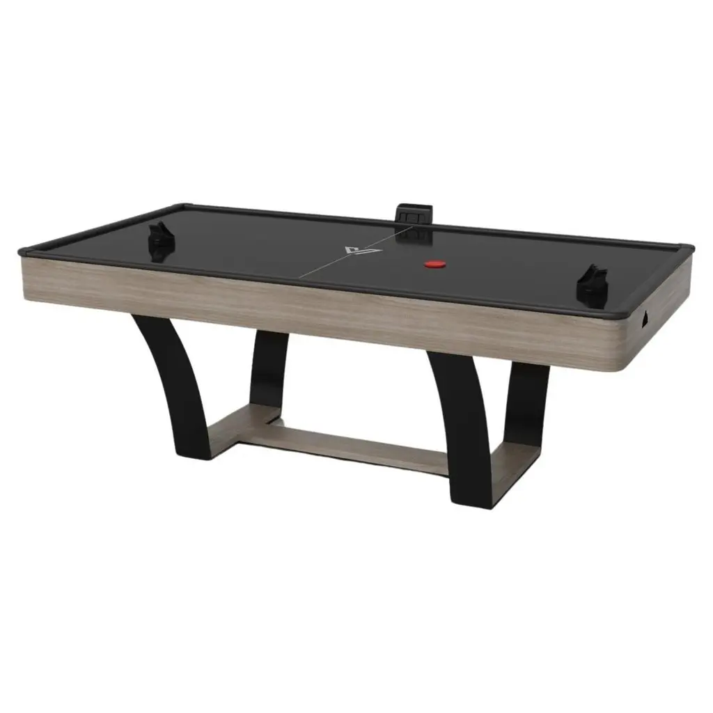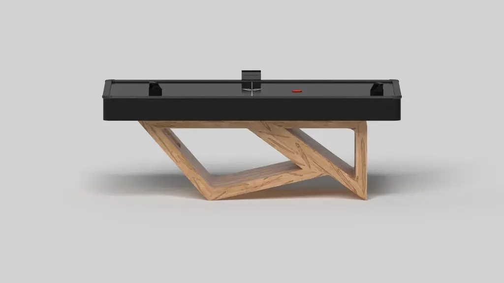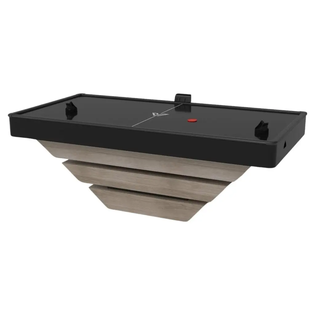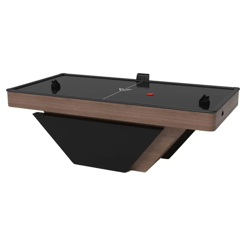 Drawing inspiration from the beauty of geometric forms, the Rumba air hockey table in brushed aluminum is characterized by a series of hollow and solid shapes that form an offset asymmetric base. Accented with a black top for professional game play, this custom table features a high-end designer appeal that coordinates seamlessly into any modern room design.Size:88”X45”X31”