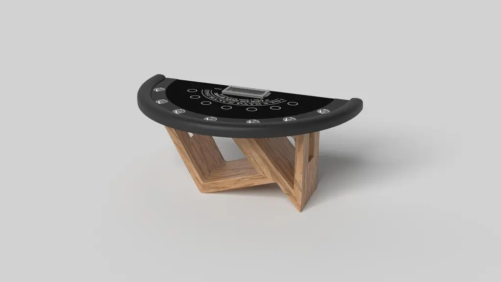 Drawing inspiration from the beauty of geometric forms, the Rumba blackjack table in brushed aluminum is characterized by a series of hollow and solid shapes that form an offset asymmetric base. Accented with a chip rack and betting circles for professional game play, this custom table features a high-end designer appeal that coordinates seamlessly into any modern room design.Size:88”X46”X30” (Bar Height)Custom Sizes Available Per Request