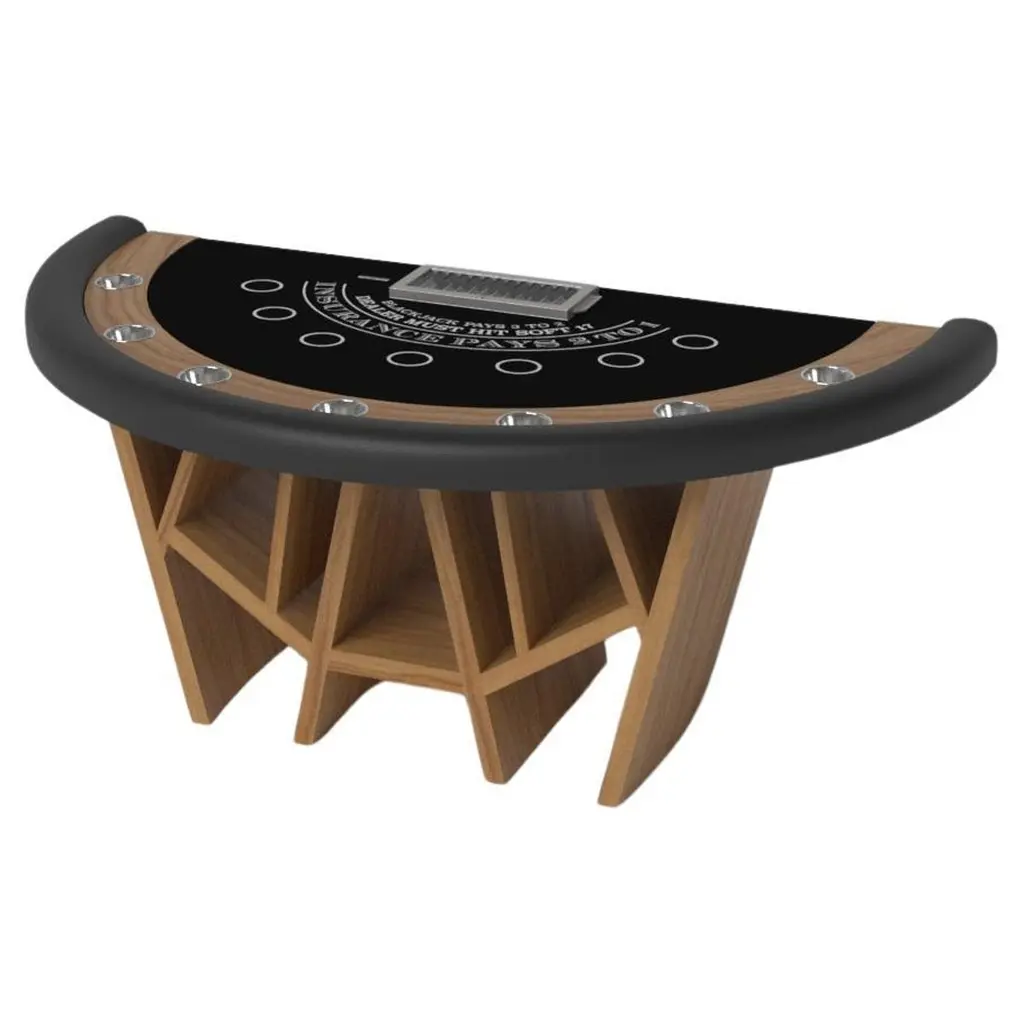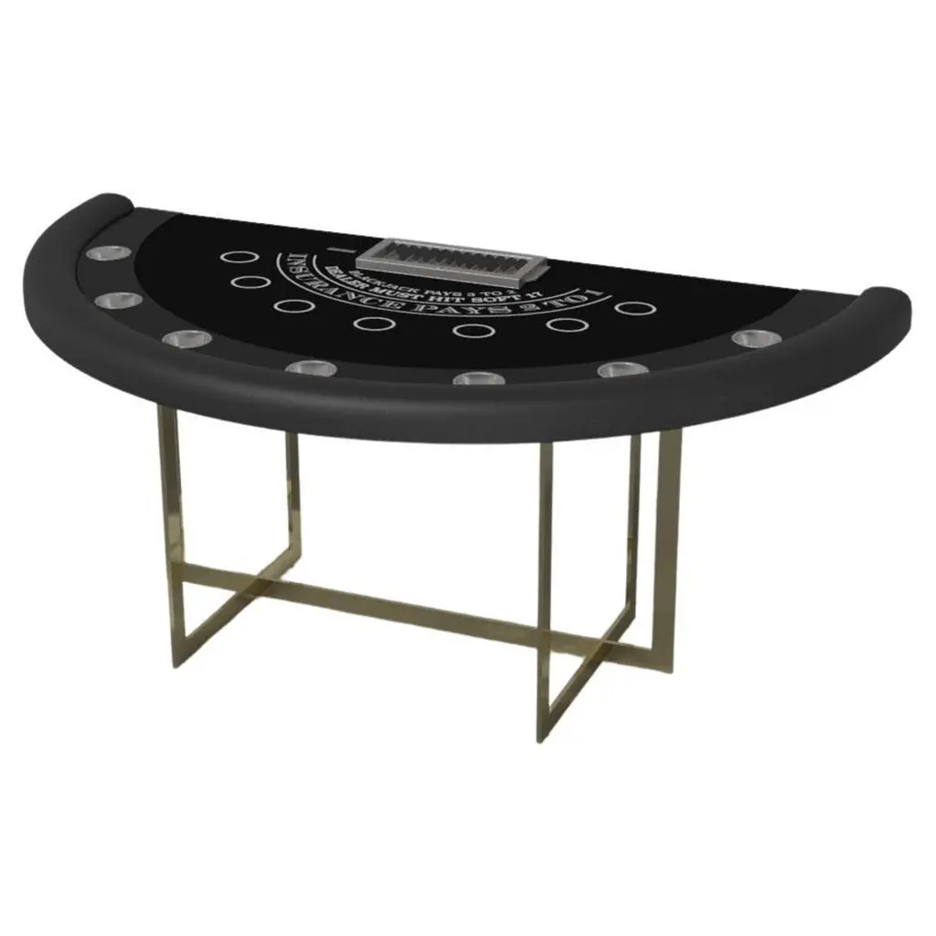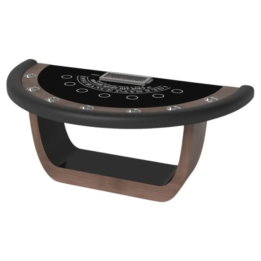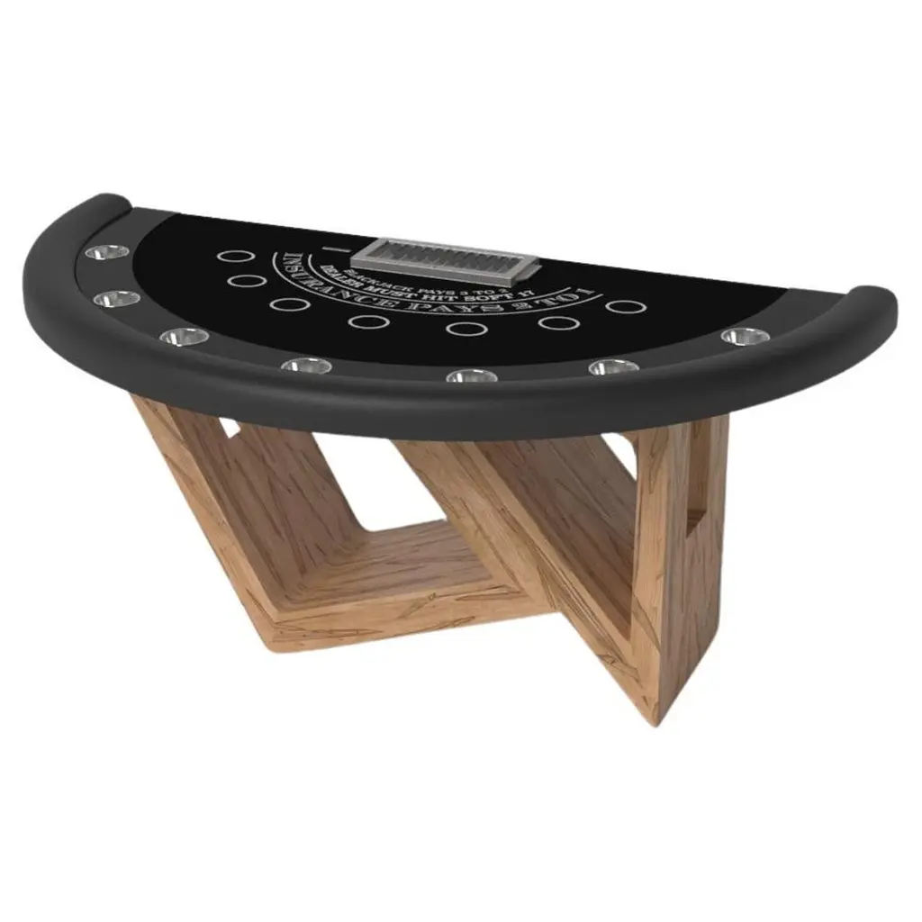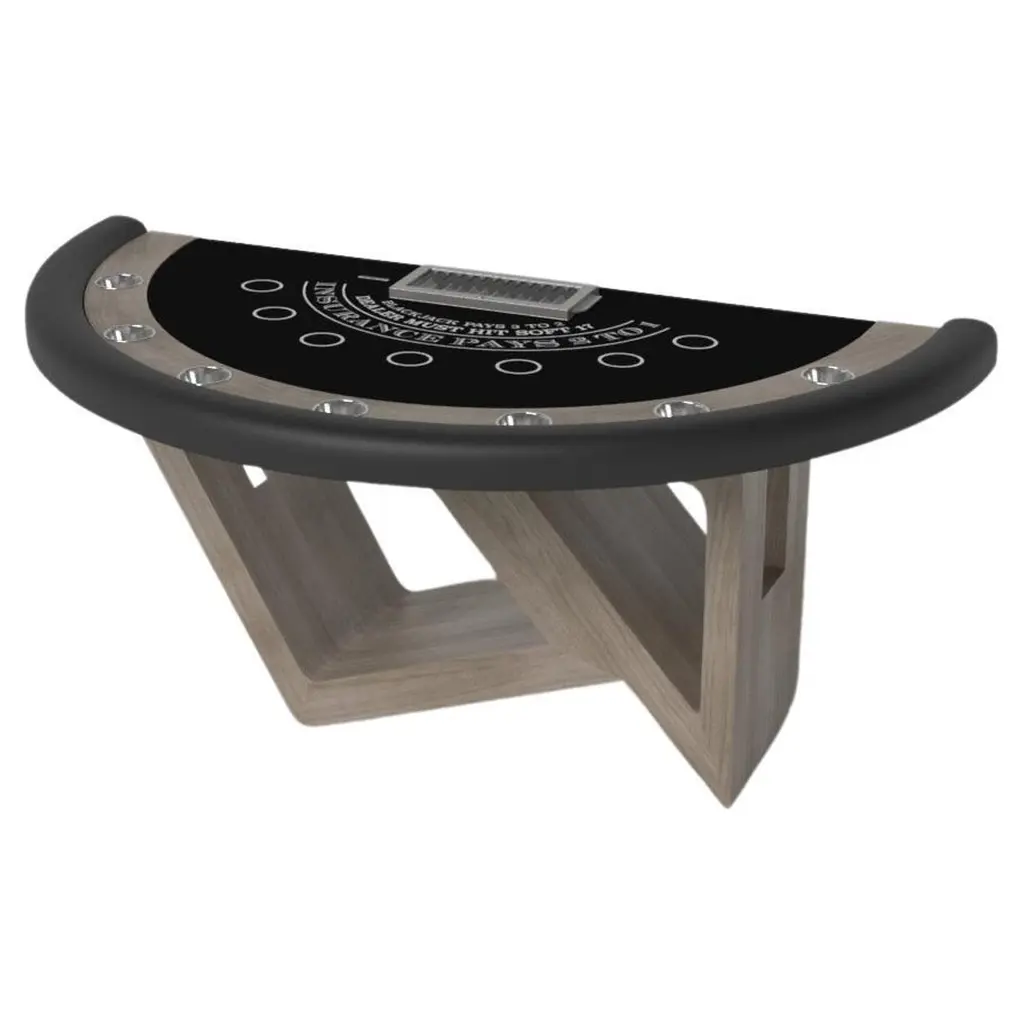 Drawing inspiration from the beauty of geometric forms, the Rumba blackjack table in brushed aluminum is characterized by a series of hollow and solid shapes that form an offset asymmetric base. Accented with a chip rack and betting circles for professional game play, this custom table features a high-end designer appeal that coordinates seamlessly into any modern room design.Size:88”X46”X30” (Bar Height)Custom Sizes Available Per Request