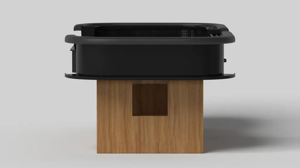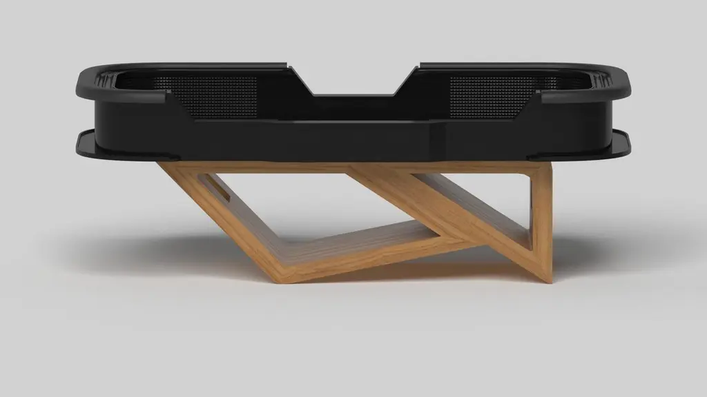 Drawing inspiration from the beauty of geometric forms, the Rumba craps table in brushed aluminum is characterized by a series of hollow and solid shapes that form an offset asymmetric base. Accented with point boxes and betting blocks for professional game play, this custom table features a high-end designer appeal that coordinates seamlessly into any modern room design.Size:117”X60”X42”Custom Sizes Available Per Request
