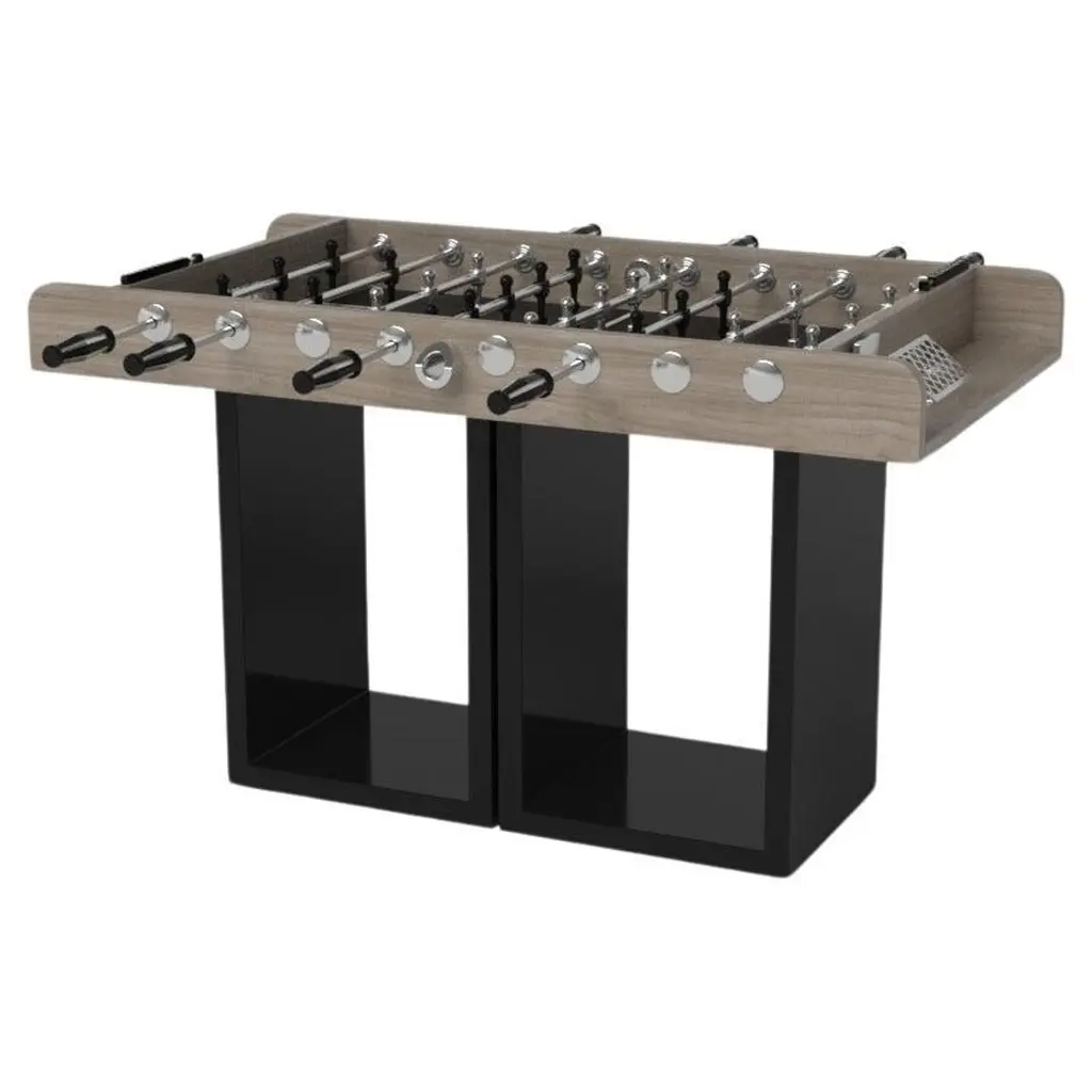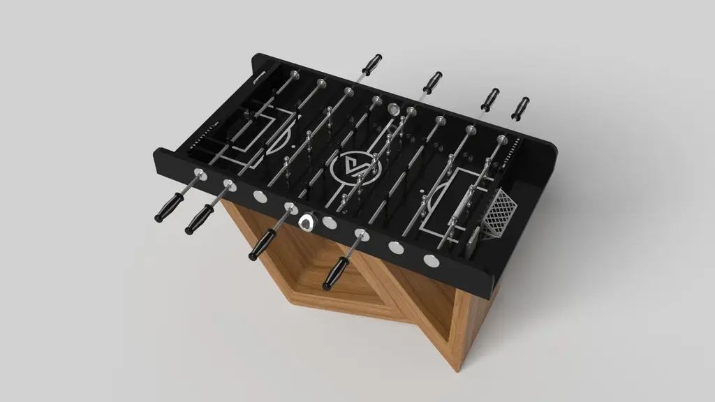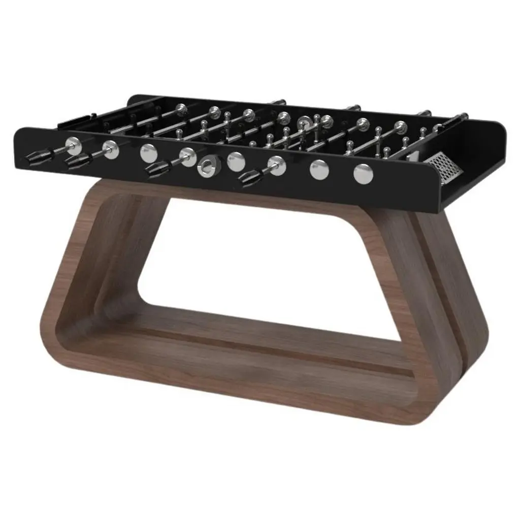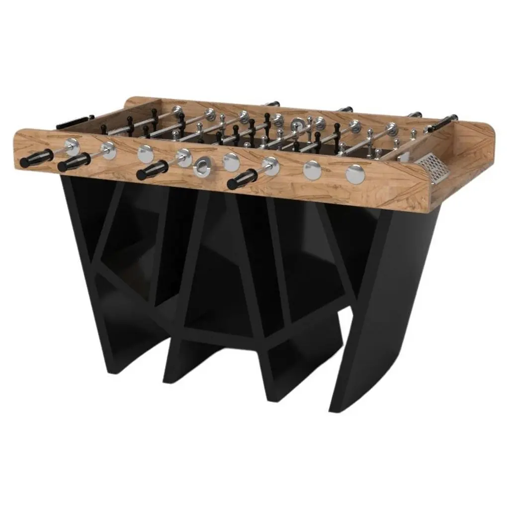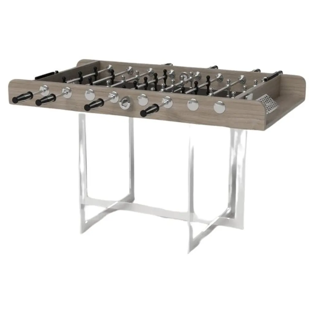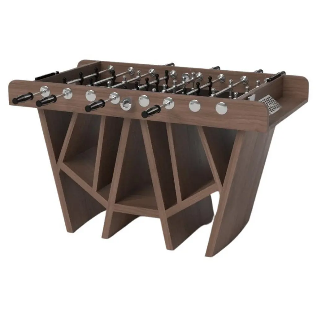 Drawing inspiration from the beauty of geometric forms, the Rumba foosball table in brushed aluminum is characterized by a series of hollow and solid shapes that form an offset asymmetric base. Accented with a high-action top for professional game play, this custom table features a high-end designer appeal that coordinates seamlessly into any modern room design.Size:62”X31”X36”