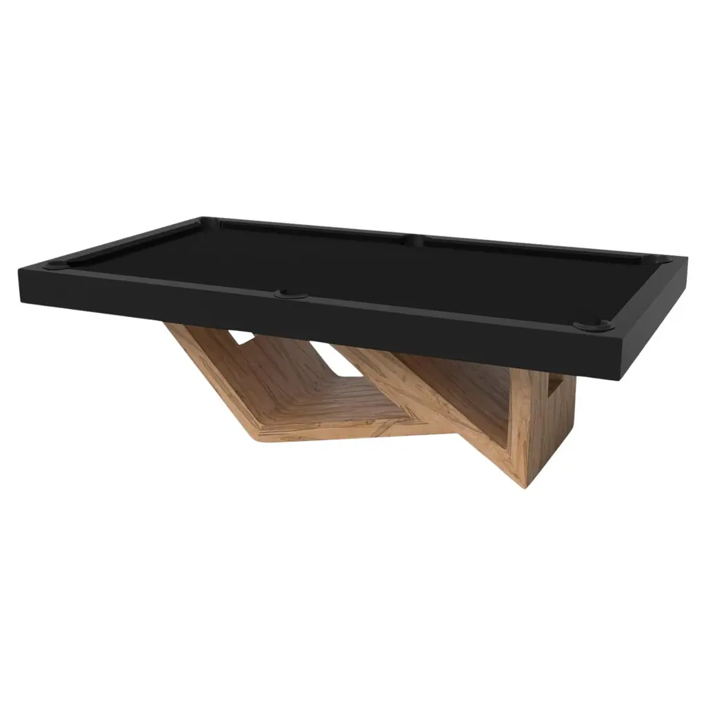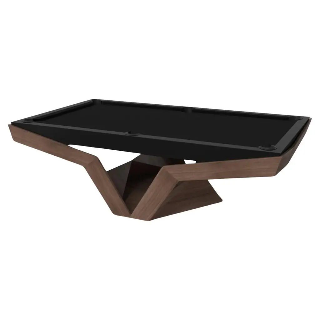 Drawing inspiration from the beauty of geometric forms, the Rumba pool table in brushed aluminum is characterized by a series of hollow and solid shapes that form an offset asymmetric base. Accented with a felt top for professional game play, this custom table features a high-end designer appeal that coordinates seamlessly into any modern room design.Size:7 Foot - 91”X52”Playing Area Of 39”X78”8 Foot – 101”X57”Playing Area Of 88”X44”