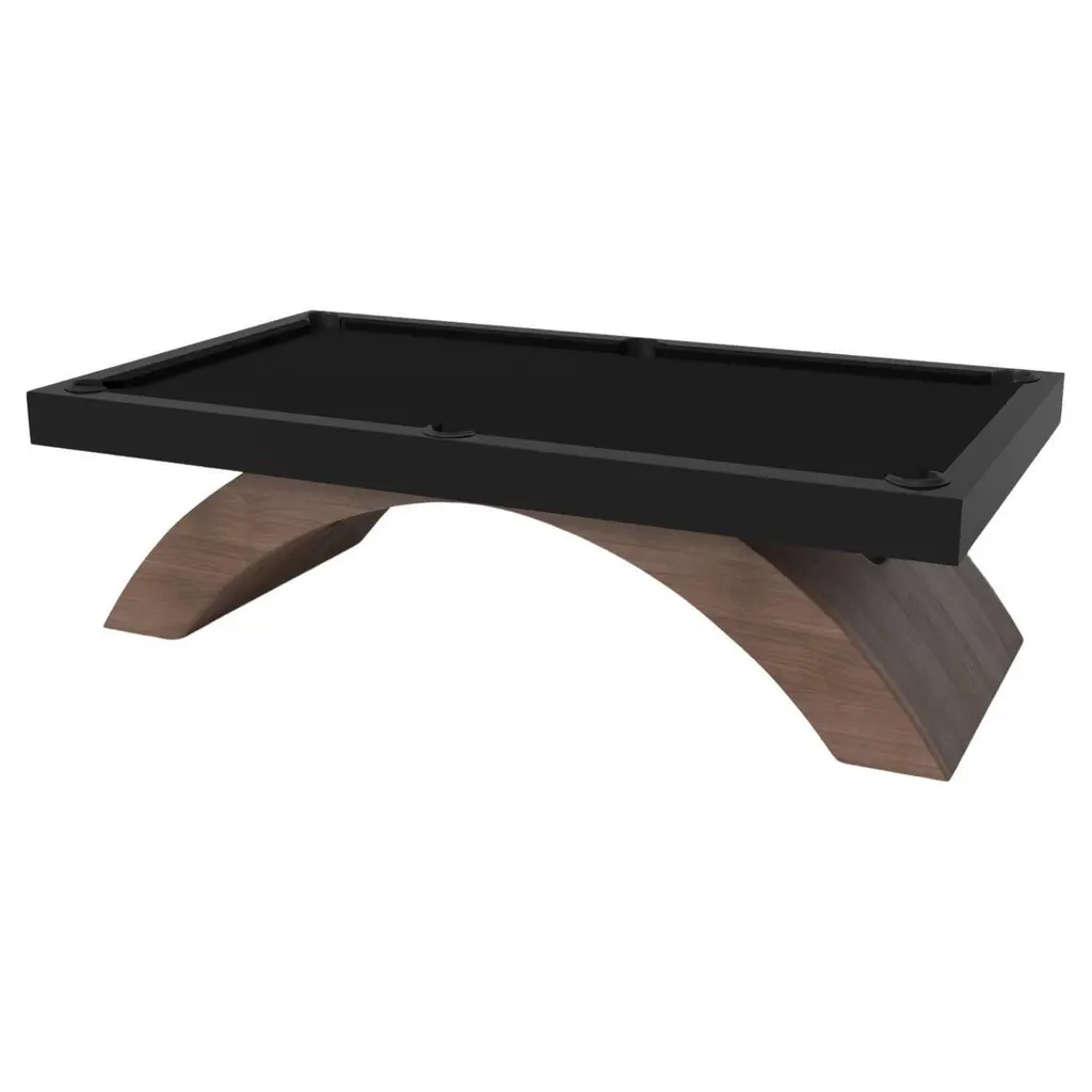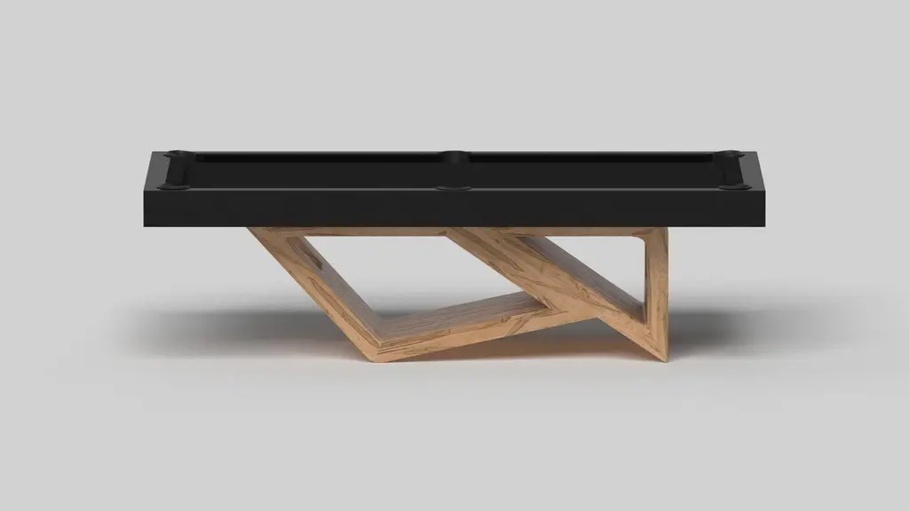 Drawing inspiration from the beauty of geometric forms, the Rumba pool table in brushed aluminum is characterized by a series of hollow and solid shapes that form an offset asymmetric base. Accented with a felt top for professional game play, this custom table features a high-end designer appeal that coordinates seamlessly into any modern room design.Size:9 Foot – 113”X63”Playing Area: 100”X50”