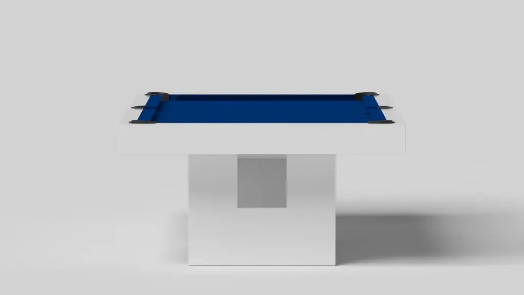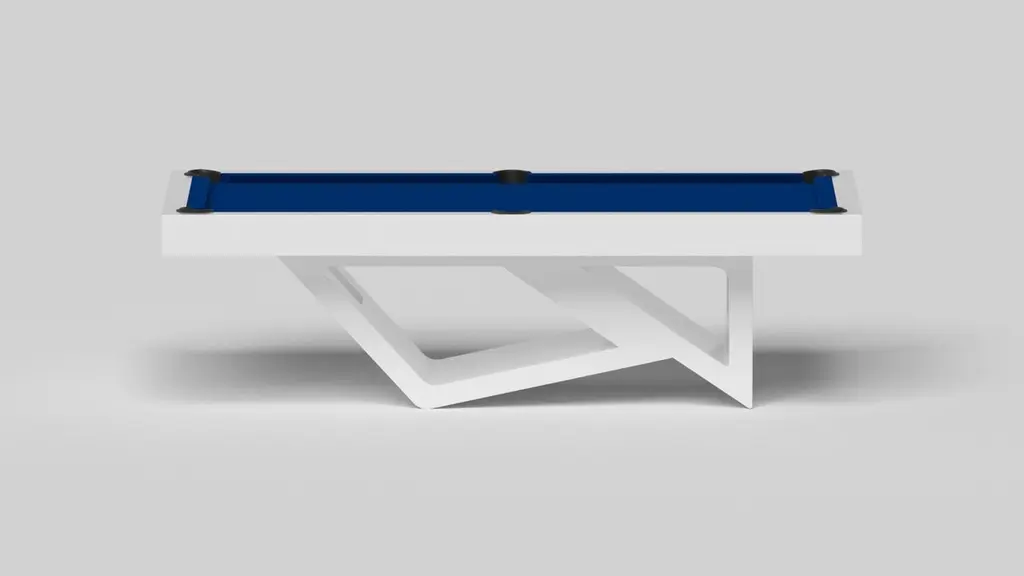 Drawing inspiration from the beauty of geometric forms, the Rumba pool table in brushed aluminum is characterized by a series of hollow and solid shapes that form an offset asymmetric base. Accented with a felt top for professional game play, this custom table features a high-end designer appeal that coordinates seamlessly into any modern room design.Size:8.5 Foot – 108”X60”Playing Area: 92”X46”