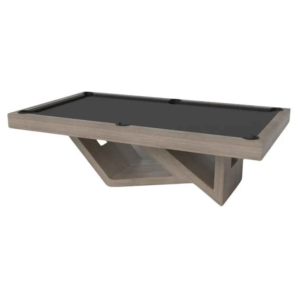 Drawing inspiration from the beauty of geometric forms, the Rumba pool table in brushed aluminum is characterized by a series of hollow and solid shapes that form an offset asymmetric base. Accented with a felt top for professional game play, this custom table features a high-end designer appeal that coordinates seamlessly into any modern room design.Size:7 Foot - 91”X52”Playing Area Of 39”X78”8 Foot – 101”X57”Playing Area Of 88”X44”