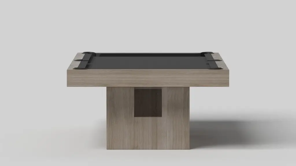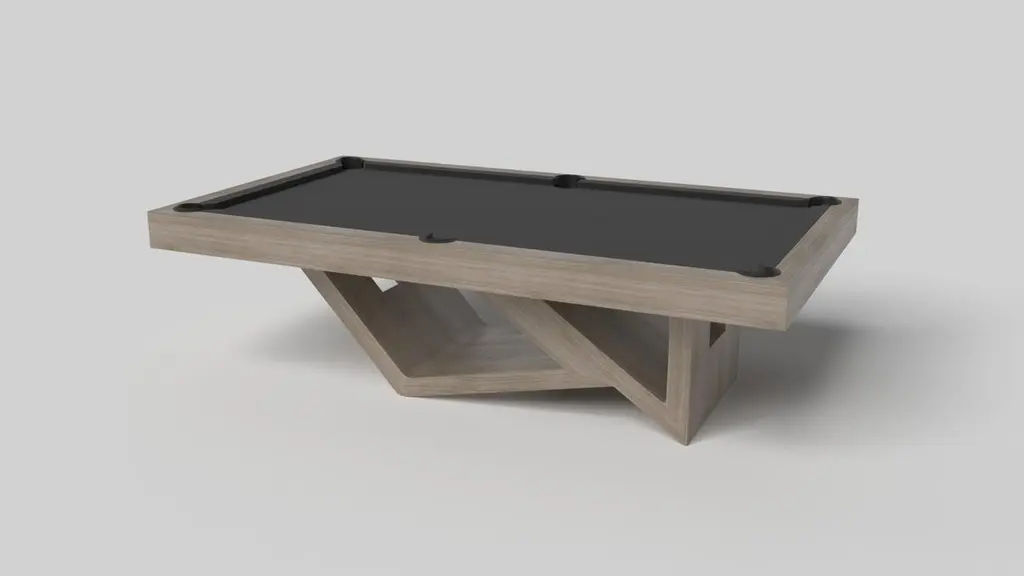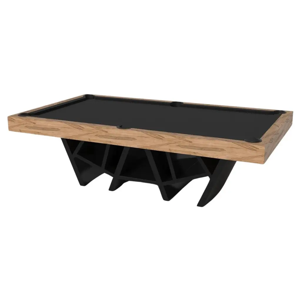Drawing inspiration from the beauty of geometric forms, the Rumba pool table in brushed aluminum is characterized by a series of hollow and solid shapes that form an offset asymmetric base. Accented with a felt top for professional game play, this custom table features a high-end designer appeal that coordinates seamlessly into any modern room design.Size:9 Foot – 113”X63”Playing Area: 100”X50”