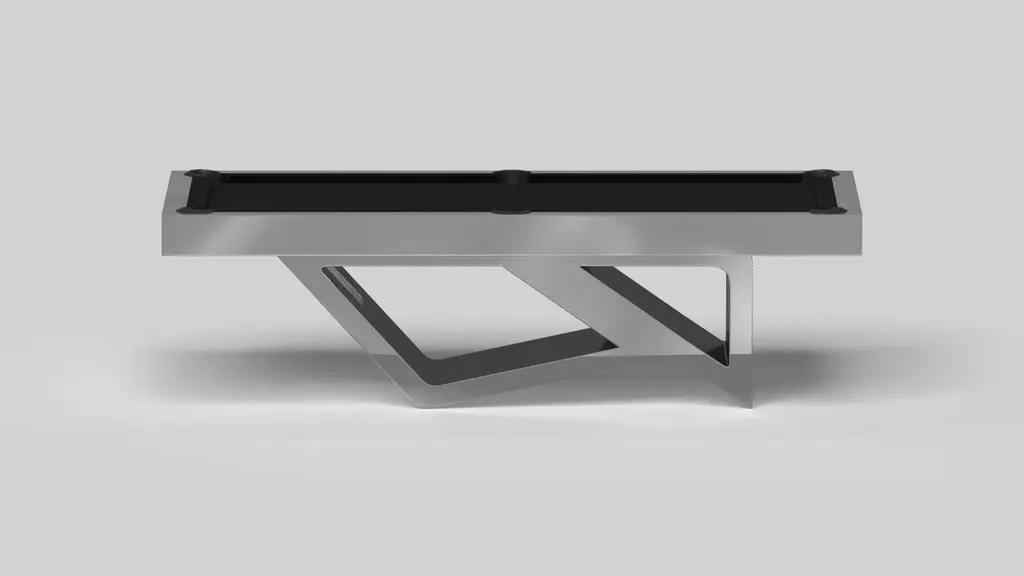 Drawing inspiration from the beauty of geometric forms, the Rumba pool table in brushed aluminum is characterized by a series of hollow and solid shapes that form an offset asymmetric base. Accented with a felt top for professional game play, this custom table features a high-end designer appeal that coordinates seamlessly into any modern room design.Size:9 Foot – 113”X63”Playing Area: 100”X50”