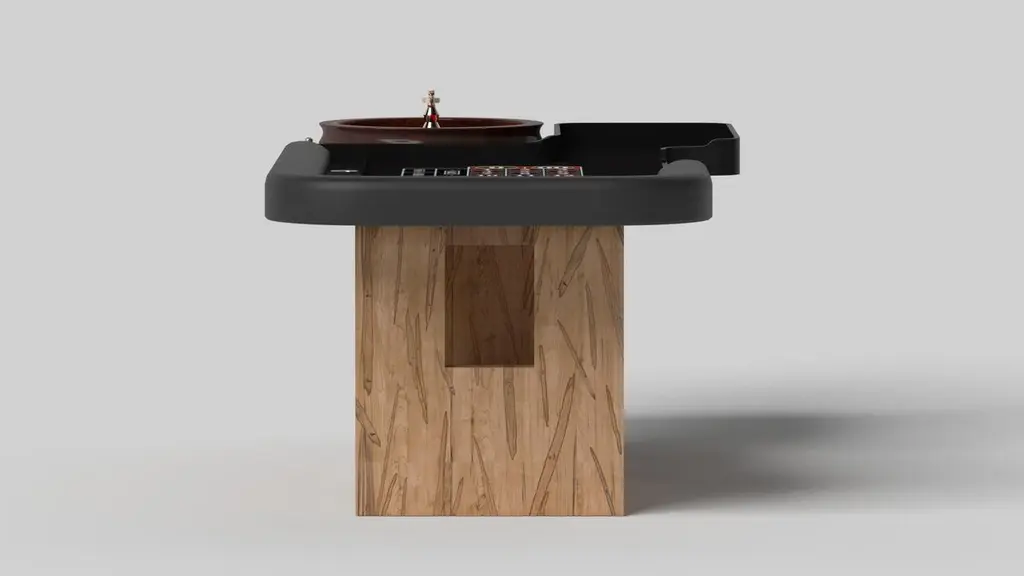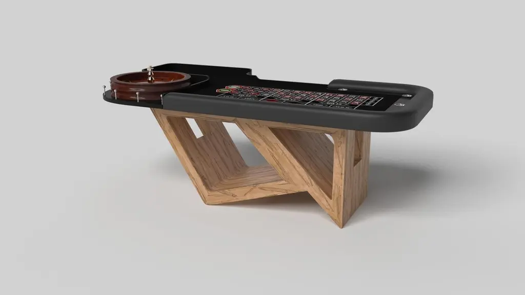 Drawing inspiration from the beauty of geometric forms, the Rumba roulette table in brushed aluminum is characterized by a series of hollow and solid shapes that form an offset asymmetric base. Accented with a roulette wheel and bet blocks for professional game play, this custom table features a high-end designer appeal that coordinates seamlessly into any modern room design.Size:98”X50”X30”Custom Sizes Available Per Request