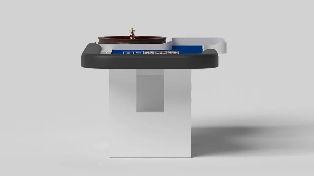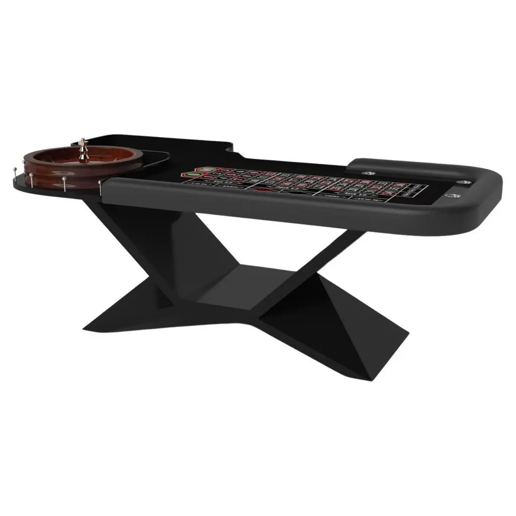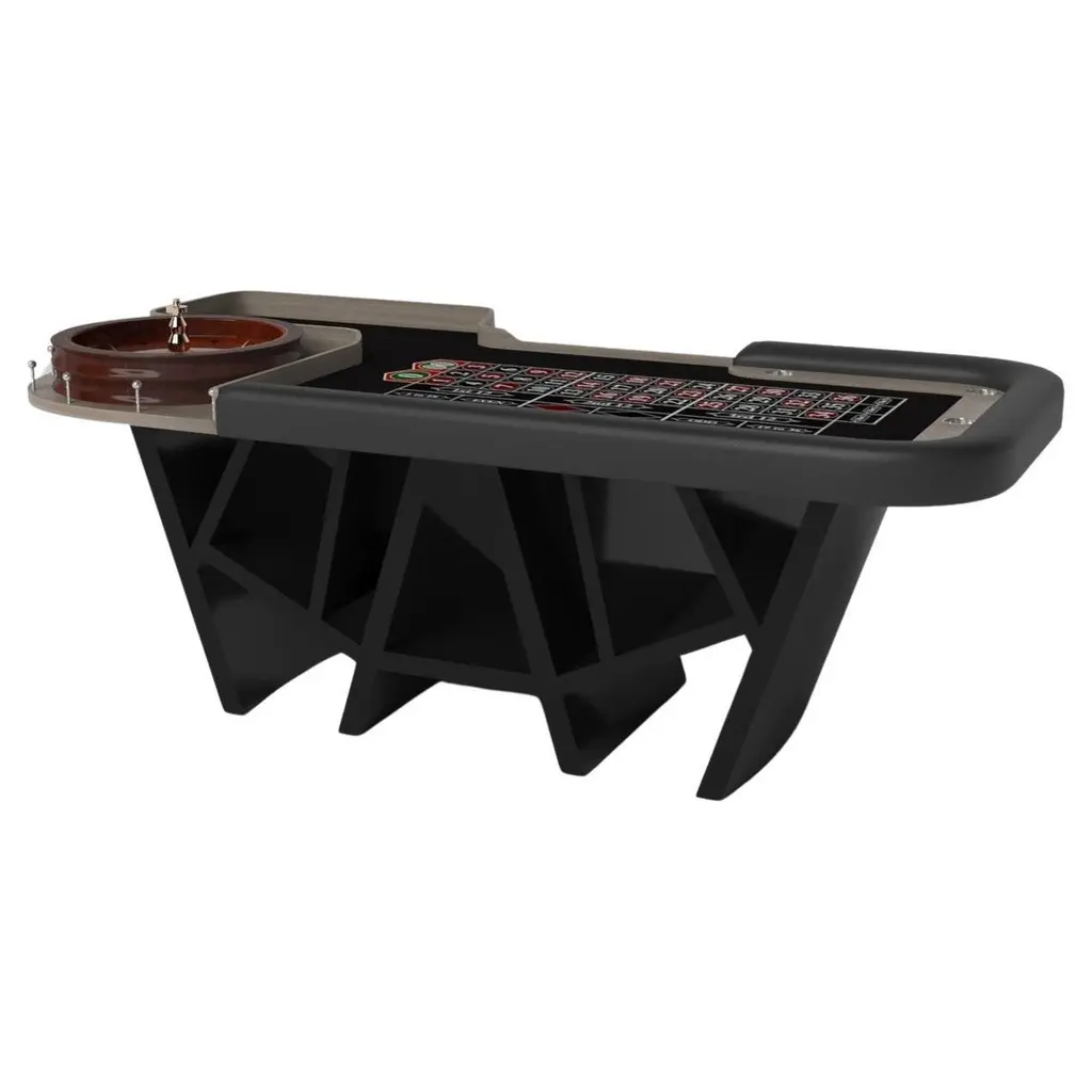 Drawing inspiration from the beauty of geometric forms, the Rumba roulette table in brushed aluminum is characterized by a series of hollow and solid shapes that form an offset asymmetric base. Accented with a roulette wheel and bet blocks for professional game play, this custom table features a high-end designer appeal that coordinates seamlessly into any modern room design.Size:98”X50”X30”Custom Sizes Available Per Request