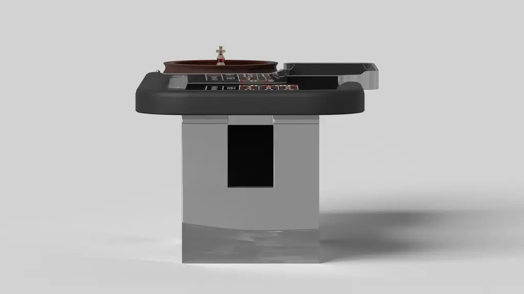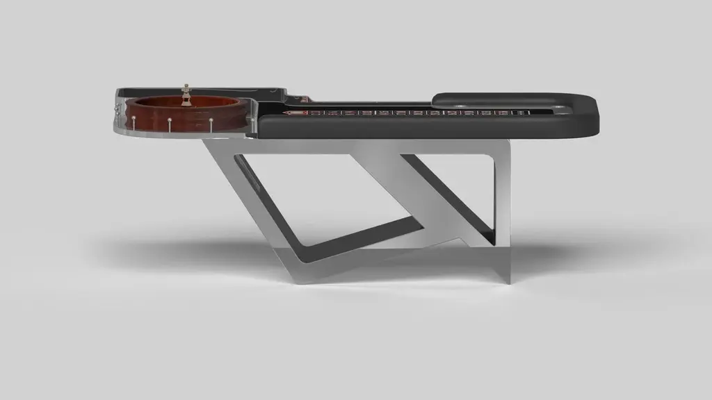 Drawing inspiration from the beauty of geometric forms, the Rumba roulette table in brushed aluminum is characterized by a series of hollow and solid shapes that form an offset asymmetric base. Accented with a roulette wheel and bet blocks for professional game play, this custom table features a high-end designer appeal that coordinates seamlessly into any modern room design.Size:98”X50”X30”Custom Sizes Available Per Request