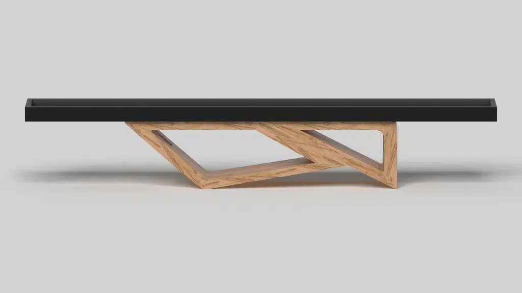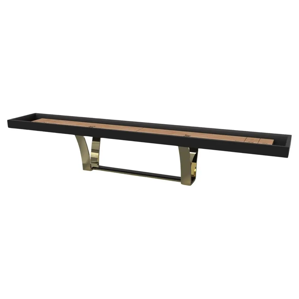 Drawing inspiration from the beauty of geometric forms, the Rumba shuffleboard table in brushed aluminum is characterized by a series of hollow and solid shapes that form an offset asymmetric base. Accented with a smooth professional grade Maple wood surface top for professional game play, this custom table features a high-end designer appeal that coordinates seamlessly into any modern room design.Size:18 Foot - 216”X32”X34”Playing Area Of 200”X20”
