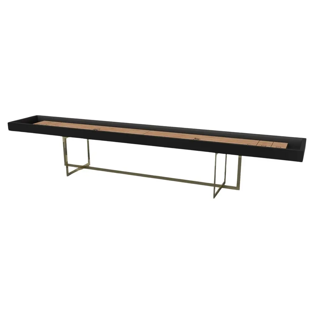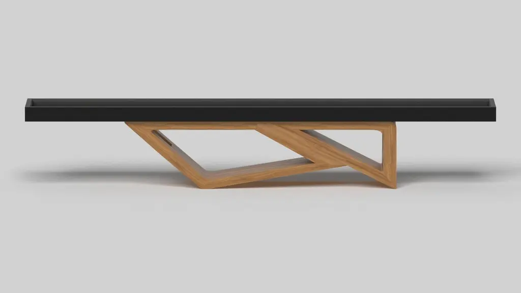 Drawing inspiration from the beauty of geometric forms, the Rumba shuffleboard table in brushed aluminum is characterized by a series of hollow and solid shapes that form an offset asymmetric base. Accented with a smooth professional grade Maple wood surface top for professional game play, this custom table features a high-end designer appeal that coordinates seamlessly into any modern room design.Size:22 Foot - 264”X32”X34”Playing Area Of 248”X20”