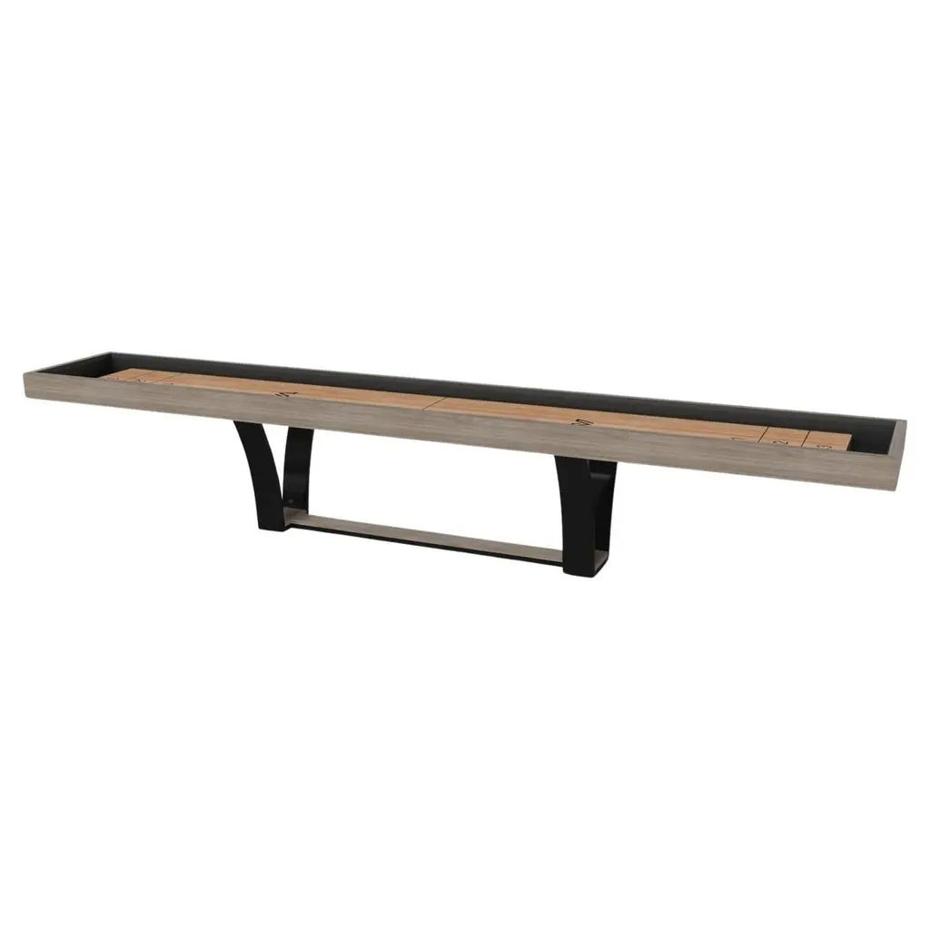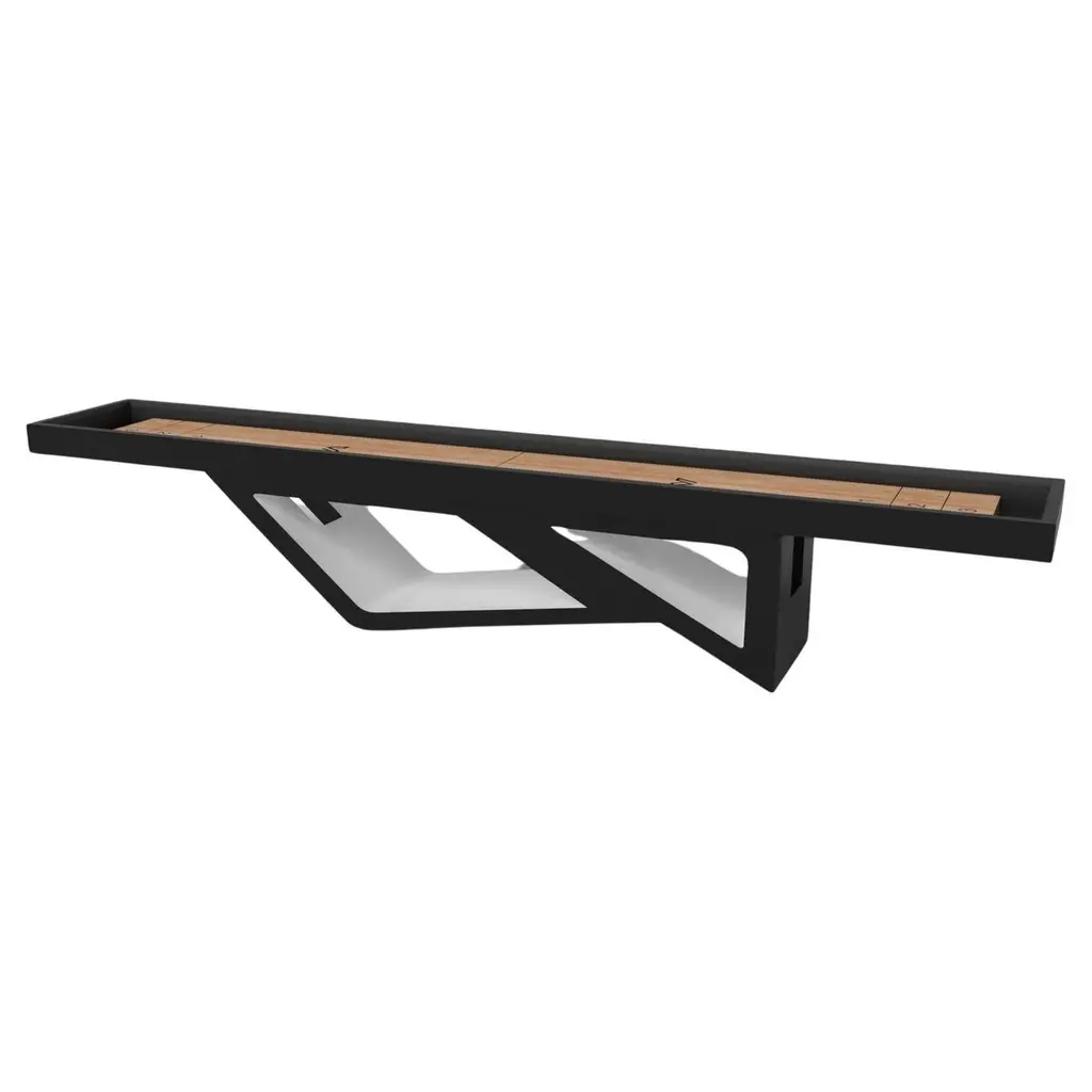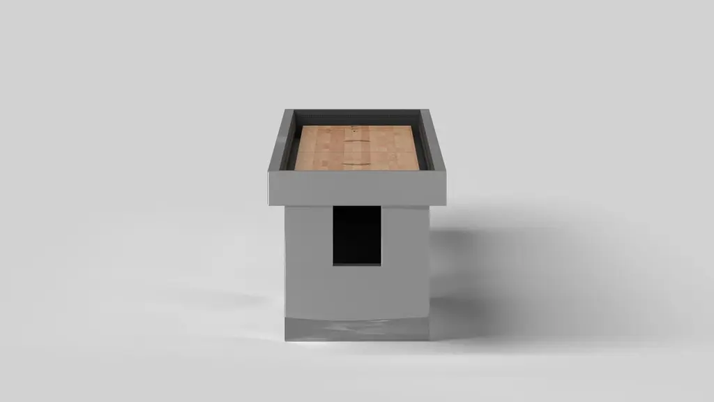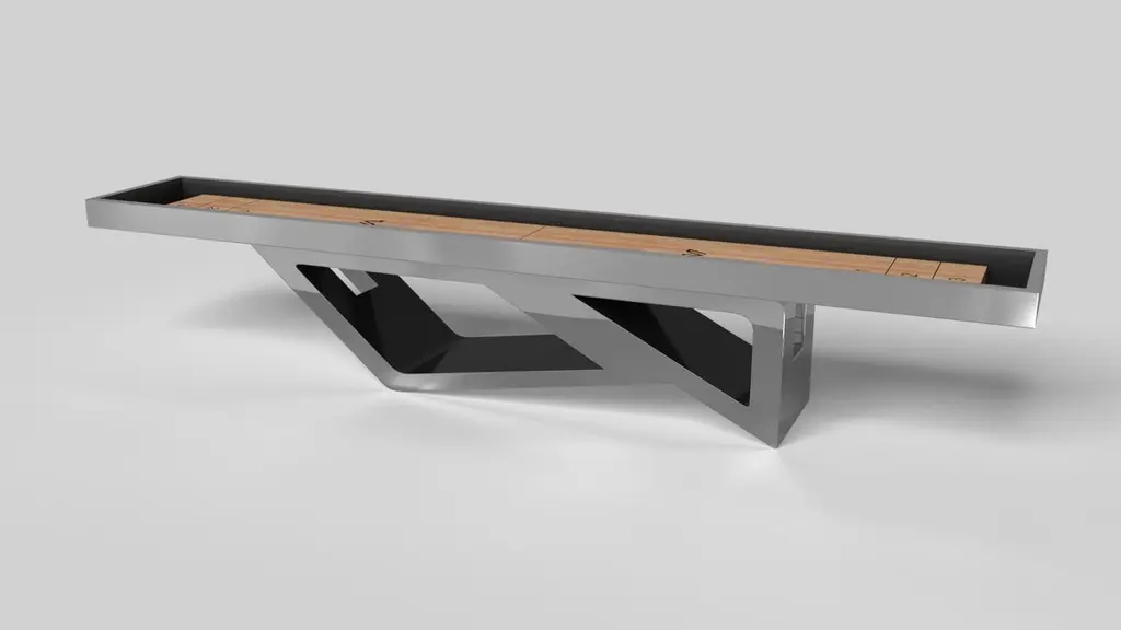 Drawing inspiration from the beauty of geometric forms, the Rumba shuffleboard table in brushed aluminum is characterized by a series of hollow and solid shapes that form an offset asymmetric base. Accented with a smooth professional grade Maple wood surface top for professional game play, this custom table features a high-end designer appeal that coordinates seamlessly into any modern room design.Size:22 Foot - 264”X32”X34”Playing Area Of 248”X20”